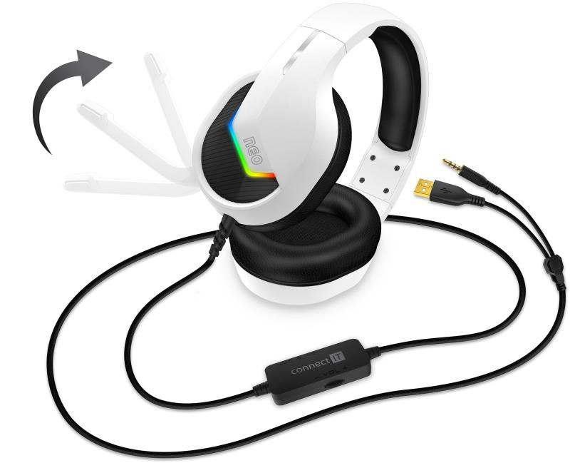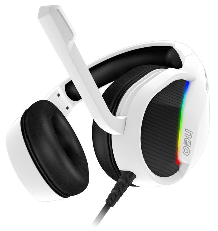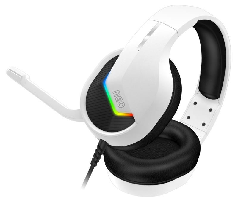 Profesionální gamingová sluchátka se sklápěcím mikrofonem NEO s podsvětlením pro hráče počítačových her. Sluchátka jsou vybavena RGB Rainbow podsvícením, ovládáním hlasitosti, sklápěcím mikrofonem a oblíbenými pozlacenými konektory. V balení najdete i 3.5 mm jack adaptér pro maximální kompatibilitu a arch promo samolepek herní řady NEO.