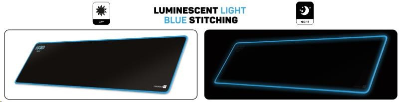 Podložka má měkký, příjemný povrch. Při velikosti herní plochy 886 × 245 mm vám nikdy nedojde prostor k pohybu. Velkou výhodou je pogumovaná protiskluzová spodní strana a antistatický povrch, po kterém bez problému bude jezdit každá myš. Materiál byl navržen tak, aby odpuzoval vodu a nečistoty. Podložka má obšité okraje speciální kvalitní svítící nití, která ve tmě jemně svítí.