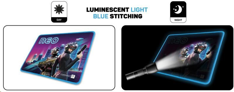 Podložka má měkký, příjemný povrch s nadčasovým cyber potiskem. Při velikosti herní plochy 320 × 245 mm vám nikdy nedojde prostor k pohybu. Velkou výhodou je pogumovaná protiskluzová spodní strana a antistatický povrch, po kterém bez problému bude jezdit každá myš. Materiál byl navržen tak, aby odpuzoval vodu a nečistoty. Podložka má obšité okraje speciální kvalitní svítící nití, která ve tmě jemně svítí.