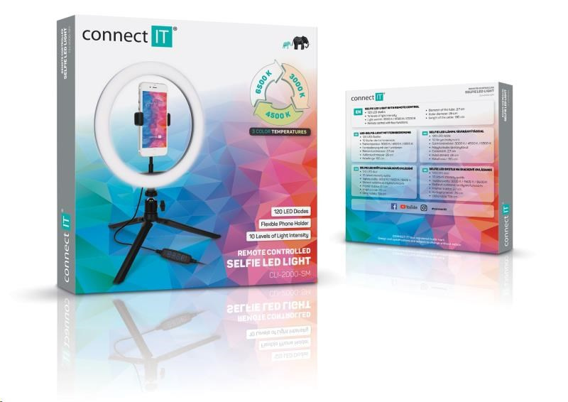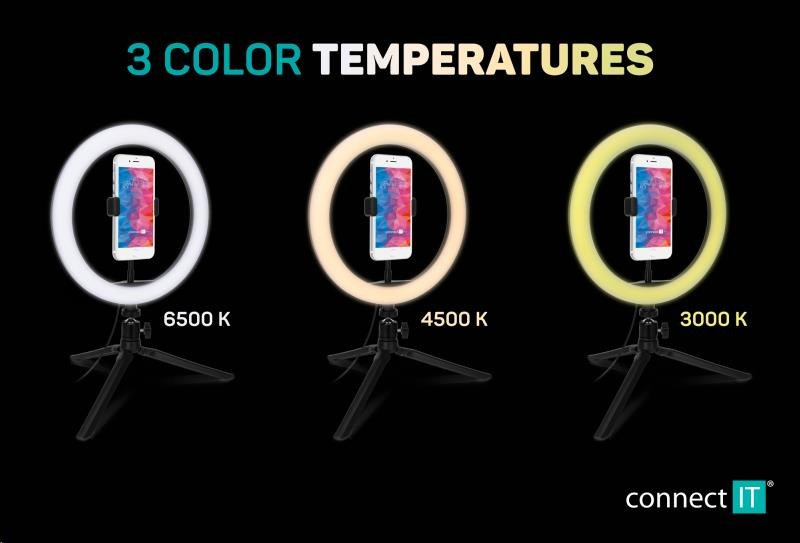 Akční nabídky na váš e-mailKruhové selfie LED světlo "Selfie10Ring" s flexibilním držákem na mobilní telefon a stativem s kulovou hlavou pro domácí i profesionální použití umožňuje nastavit barevnou teplotu světla na 3 různé úrovně (3000/4500/6500 K). Součástí výbavy je dálkový ovladač na kabelu.