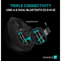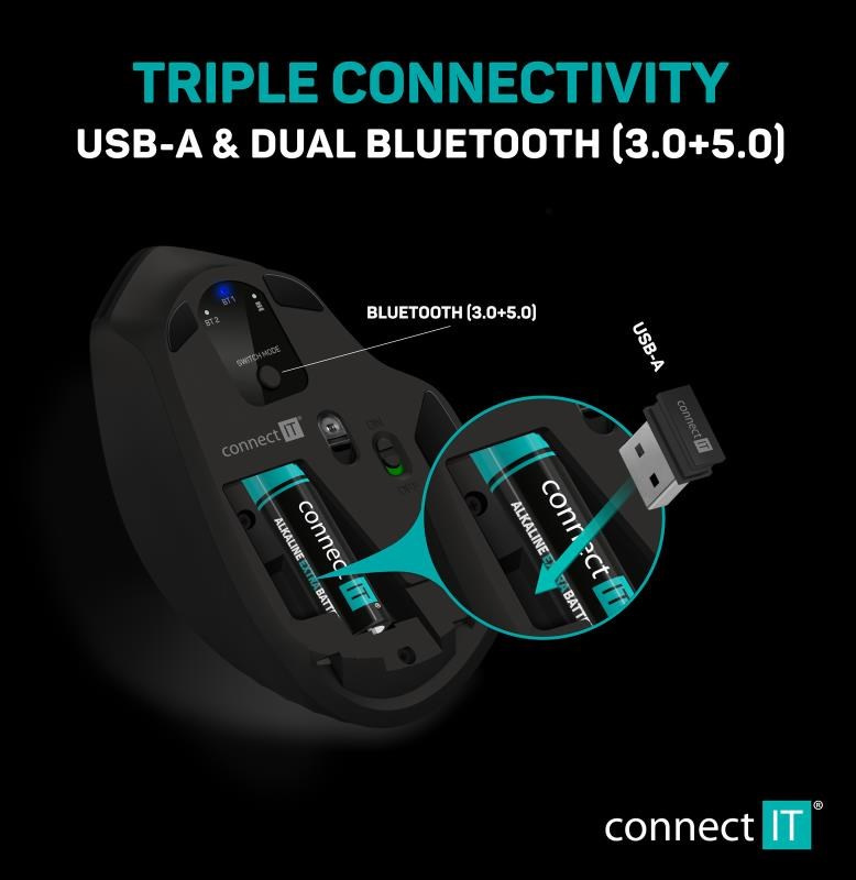 Akční nabídky na váš e-mailKancelářská tichá bezdrátová myš se třemi bezdrátovými profily podporujícími standardy Bluetooth 5.0, 3.0 a Wirelless 2,4 GHz vybavená 2 tichými tlačítky MuteButton, posuvným kolečkem a tlačítkem pro přepínání bezdrátového módu. Unikátní technologie Triple SmartSwitch umožňuje používat myš až na třech zařízeních, které podporují Bluetooth 5.0, 3.0 nebo disponují USB-A vstupem. Tato funkce je ideální pro profesionální i domácí použití všude tam, kde je potřeba pracovat s jednou myší střídavě na více počítačích nebo noteboocích. Levé a pravé tlačítko myši vybavené technologií SilentClick s tichým chodem, který při klikání nevydává žádný zvuk. Samozřejmostí je integrovaný úložný prostor pro USB Nano přijímač pod krytkou bateriového prostoru. Součástí balení je originální alkalická tužková baterie CONNECT IT.