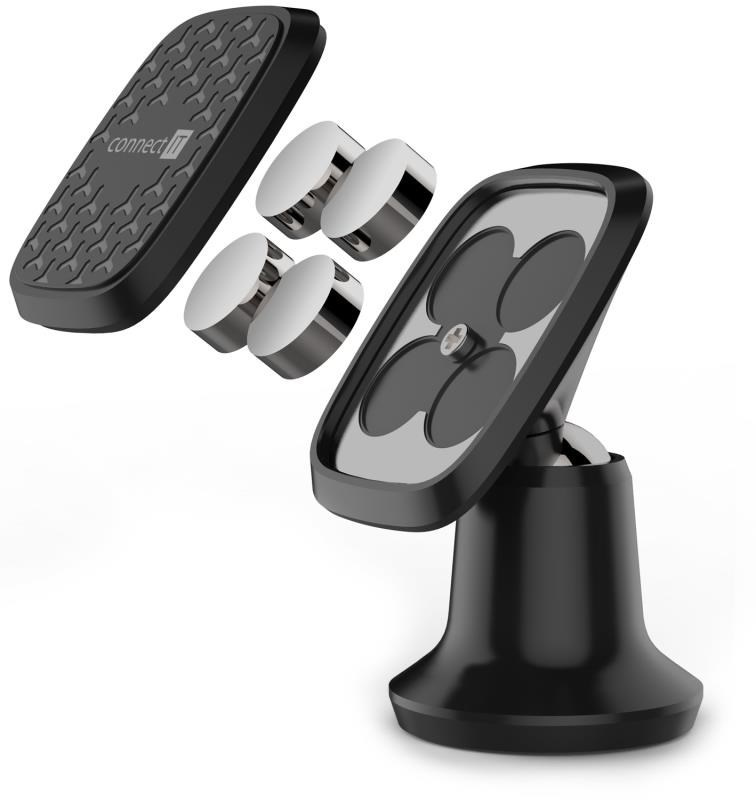 Univerzální magnetický držák InCarz 4 Ultra do auta na mobilní telefon k nalepení na palubní desku pomocí 3M samolepky. Čtyři ultrasilné magnety třídy N45 udrží telefon na držáku i při výrazných nerovnostech vozovky a vysokých rychlostech až do 350 km/h.