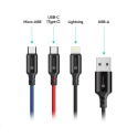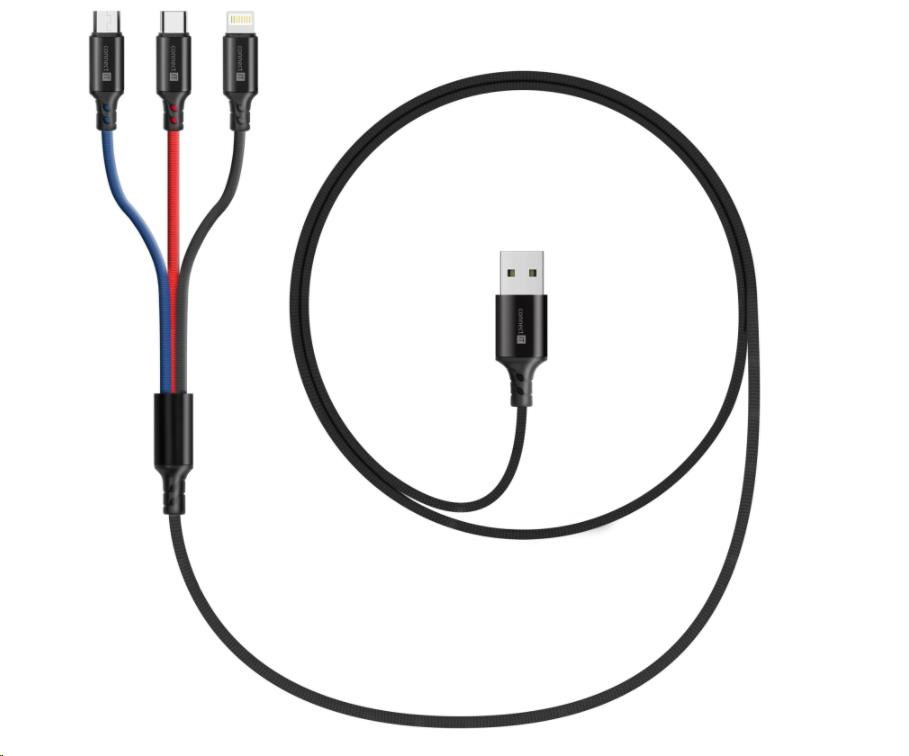 Univerzální nabíjecí kabel 3v1 na nabíjení zařízení s konektory Micro USB, Lightning a USB-C (Type C) umožňuje nabíjení až tří zařízení současně s podporou rychlého nabíjení pomocí max. proudového toku 2 A. Speciální manžetová nadstavba konektorů Micro USB, Lightning i USB-C (Type C) zaručuje lepší přístupnost k nabíjecím zdířkám mobilních telefonů v pouzdrech.