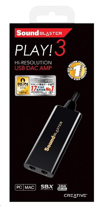 Akční nabídky na váš e-mailZvuková karta Sound Blaster PLAY! 3 obsahuje USB DAC převodník a zesilovač a umožňuje rychle rozšířit zvukové vybavení základní desky. Je vhodná pro počítače PC i Mac. Ukrývá výkonný zesilovač pro celou řadu sluchátek: od jednoduchých mobilních sluchátek do uší po herní a studiová sluchátka. Software Sound Blaster PLAY! 3 Control Panel, který je k dispozici ke stažení, nabízí úžasně realistický zvuk a úchvatné zvukové efekty. Rovněž obsahuje optimalizované profily pro vybrané značky sluchátek.