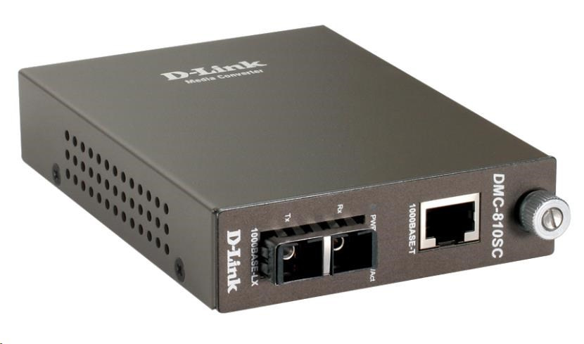 DMC-810SC: 1000BaseT to 1000BaseLX (SC) Singlemode Media Converter - včetně napájecího zdroje This converter converts 1000BASE-T Gigabit twisted-pair signals to 1000BASE-LX Gigabit single-mode fiber signals. Maximum fiber cable distance is 10km. 1 RJ-45 port and 1 fiber port (SC type connector) are provided..
