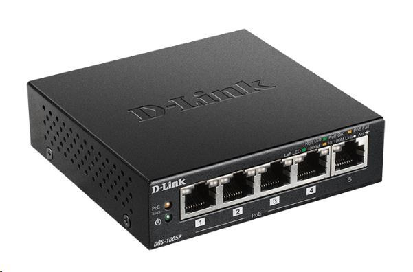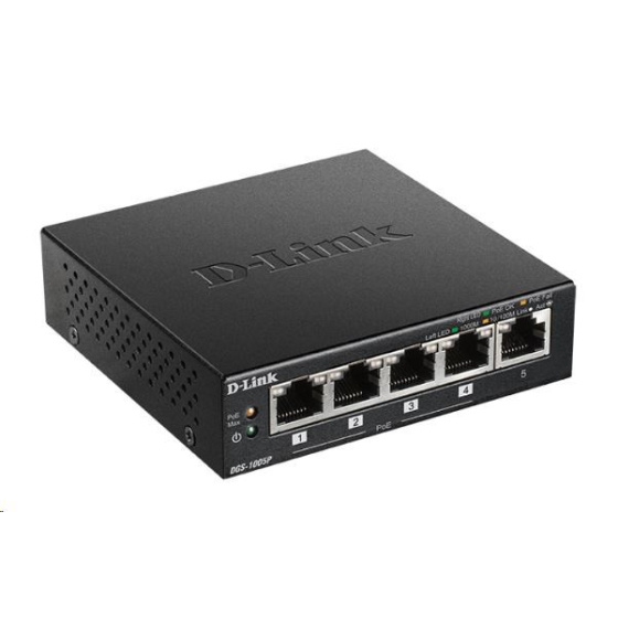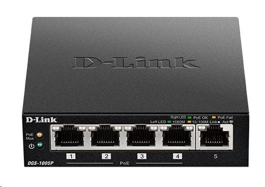 D-Link DGS-1005P 5-port Gigabit Desktop PoE+ Switch, 4 porty jsou PoE+, PoE budget 60W