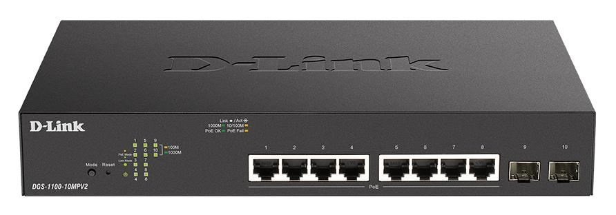 D-Link DGS-1100-10MPV2 10-Port PoE+ Gigabit Smart Managed Switch, 8x PoE gigabit, 2x SFP, PoE budget 130W