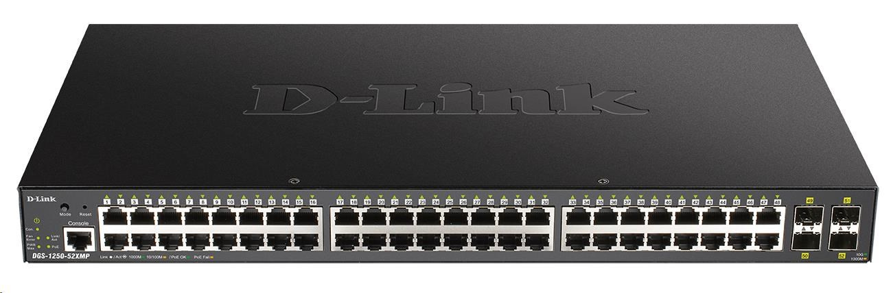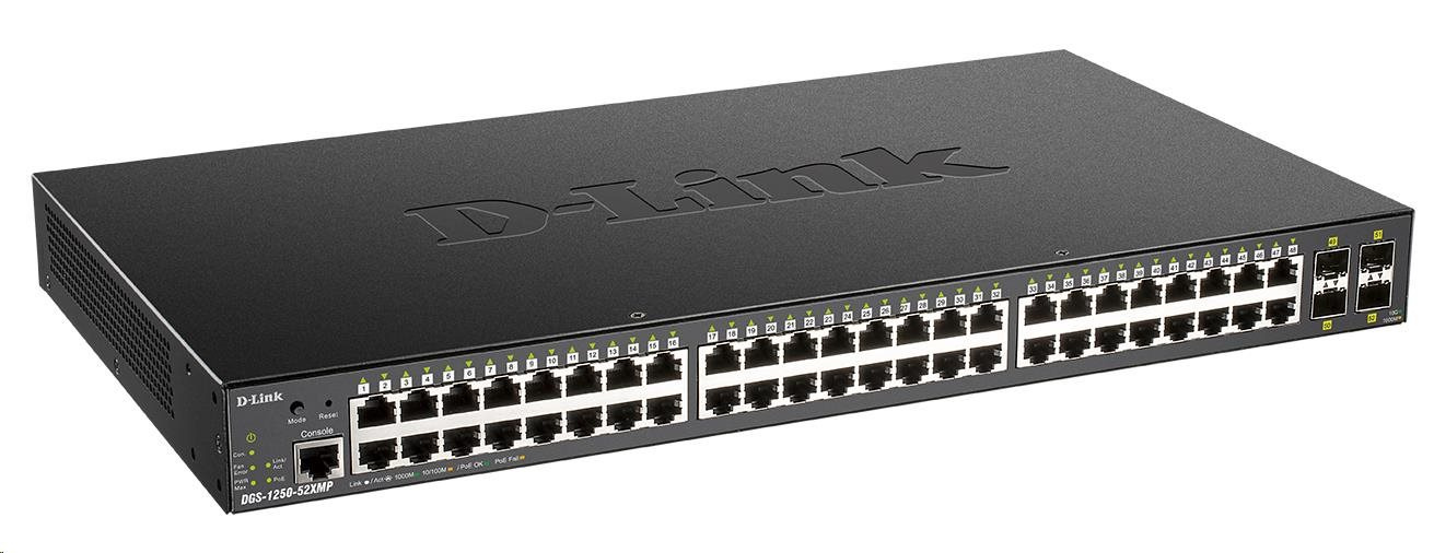 Popis D-Link DGS-1250-52XMP 52-Port Gigabit Smart PoE Switch, 48x GbE PoE+, 4x SFP+, PoE 370W
