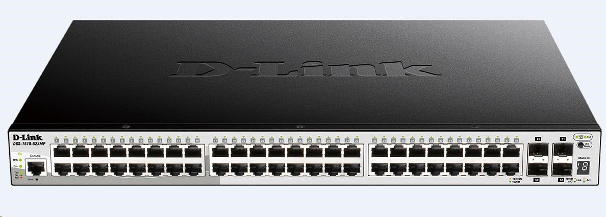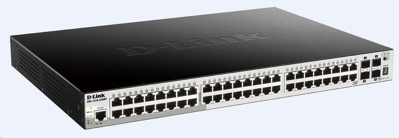 Popis D-Link DGS-1510-52XMP 52-Port Gigabit Stackable PoE Smart Managed Switch including 4 10G SFP+, 370W PoE budget