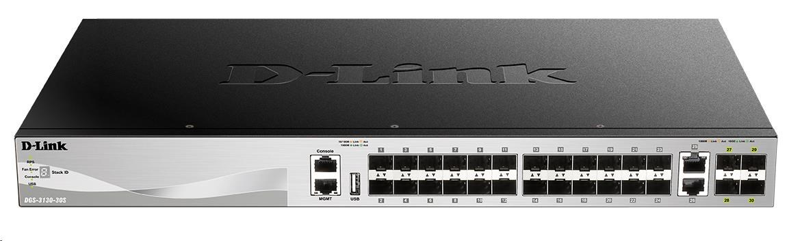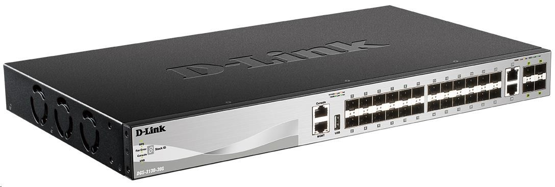 Popis D-Link DGS-3130-30S/SI L3 Stackable Managed Gigabit Switch, 24x SFP, 2x 10GBASE-T, 4x SFP+