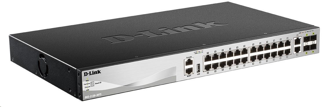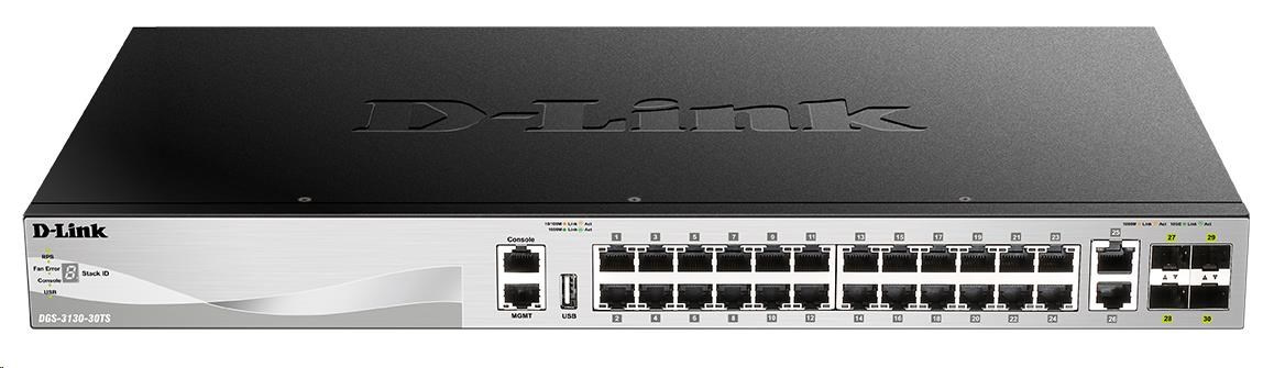 Popis D-Link DGS-3130-30TS/E L3 Stackable Managed Gigabit Switch, 24x gigabit, 2x 10GBASE-T, 4x SFP+