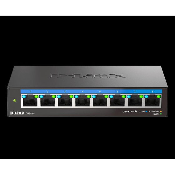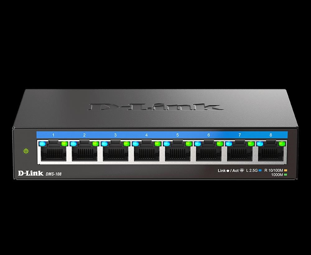 8 x 2.5 Gbps Ethernet Ports Metal housing with fanless design QoS support Environmentally friendly Ideal for Wi-Fi 6 Plug-and-play to enjoy fast connectivity The DMS-108 8-Port Multi-Gigabit Unmanaged Switch offers eight 2.5 Gigabit Ethernet for high-speed to meet your high-performance expectations.The Gigabit ports are ready for Wi-Fi 6, providing unlimited speed and performance. DMS-108 also supports IEEE 802.3az Energy-Efficient Ethernet (EEE), which can reduce power consumption and optimize usage. Without complex installation steps, plug-and-play is convenient and easy for every usage scenario. Durable Design The DMS-108 owns a metal out case with a fanless design which can improve heat dissipation and allows noise-free operation in the working area. All the high-quality designs enhance its durability and are ideally suited for Small Office Home Office (SOHO) environments. Integrated Networking The auto-sensing ports of DMS-108 flexibly build an integrated workgroup network. Through the auto-negotiation feature, these ports will detect the network speed and allow you to get the maximum speed possible for each device. Simplified Installation All the ports on the DMS-108 support automatic MDI/MDIX crossover without any cables. Each port connects the server, hub, router, or switch easily just by plugging in the cable. Besides, the DMS-107 ports feature LED indicators. With the indicators, you can easily distinguish link status..