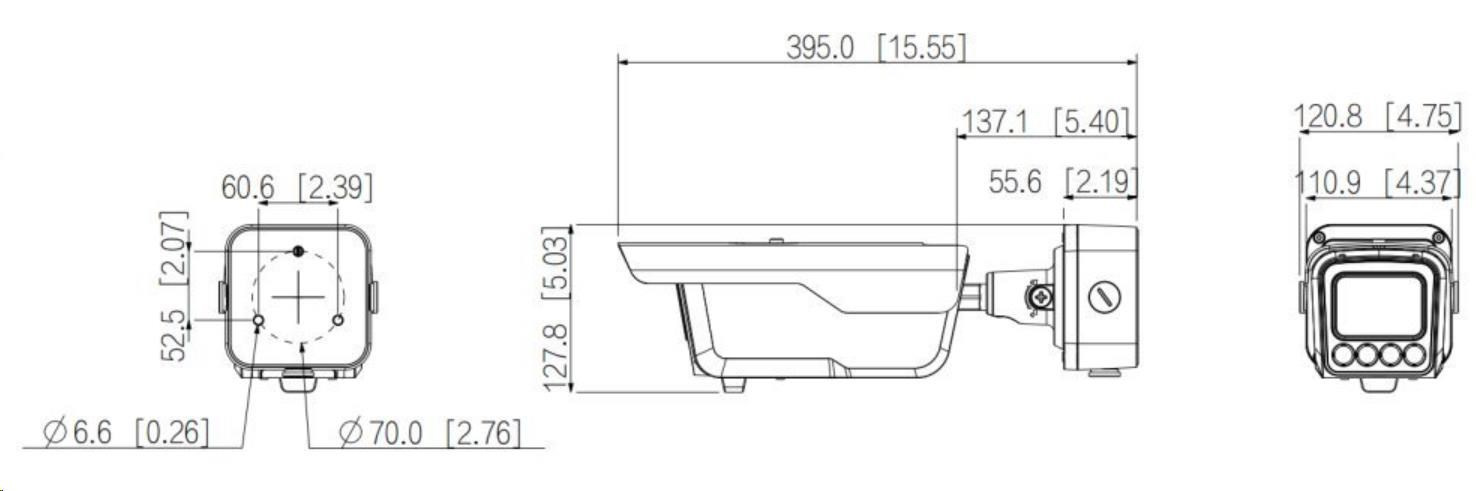 1/1,8" CMOS 4 Mpx snímač, rozlišení 2688 × 1520 při 25/30 fps, P-iris řízená clona, IR přísvit do 60 m, 1× GbE LAN, připojení RS-485, microSD slot (TF card) pro kartu do 256 GB, voděodolnost dle IP67 a antivandal dle IK10, provozní teplota -30 až +65 °C, napájení DC 12 V nebo PoE (802.3at) 44–57 V.