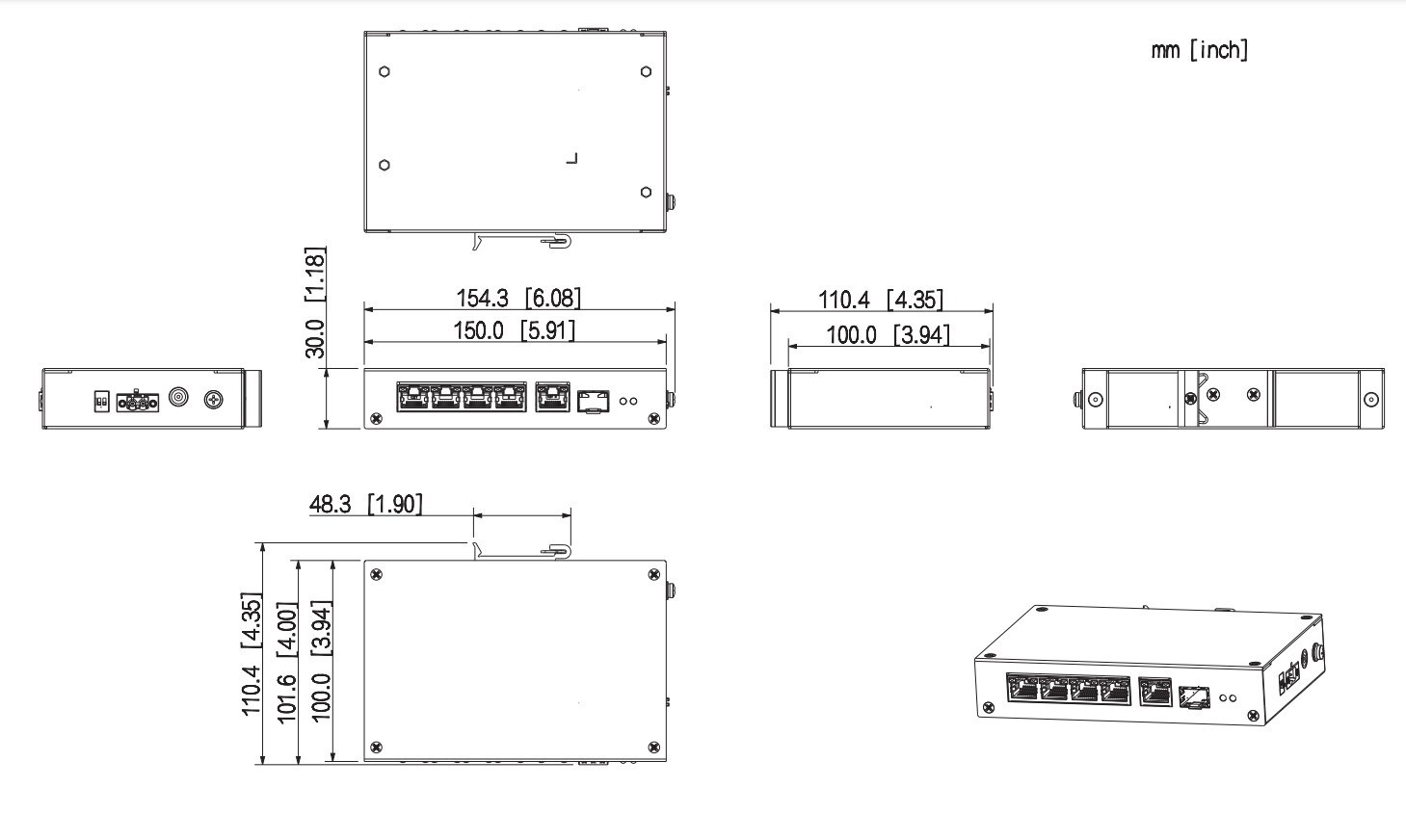 Port pro přenos dat: Port 1–4: 4 × RJ-45 10/100 Mbps (PoE); Port 5: 1 × RJ-45 10/100/1000 Mbps (Uplink); Port 6: 1 × SFP 100/1000 Mbps (Uplink)