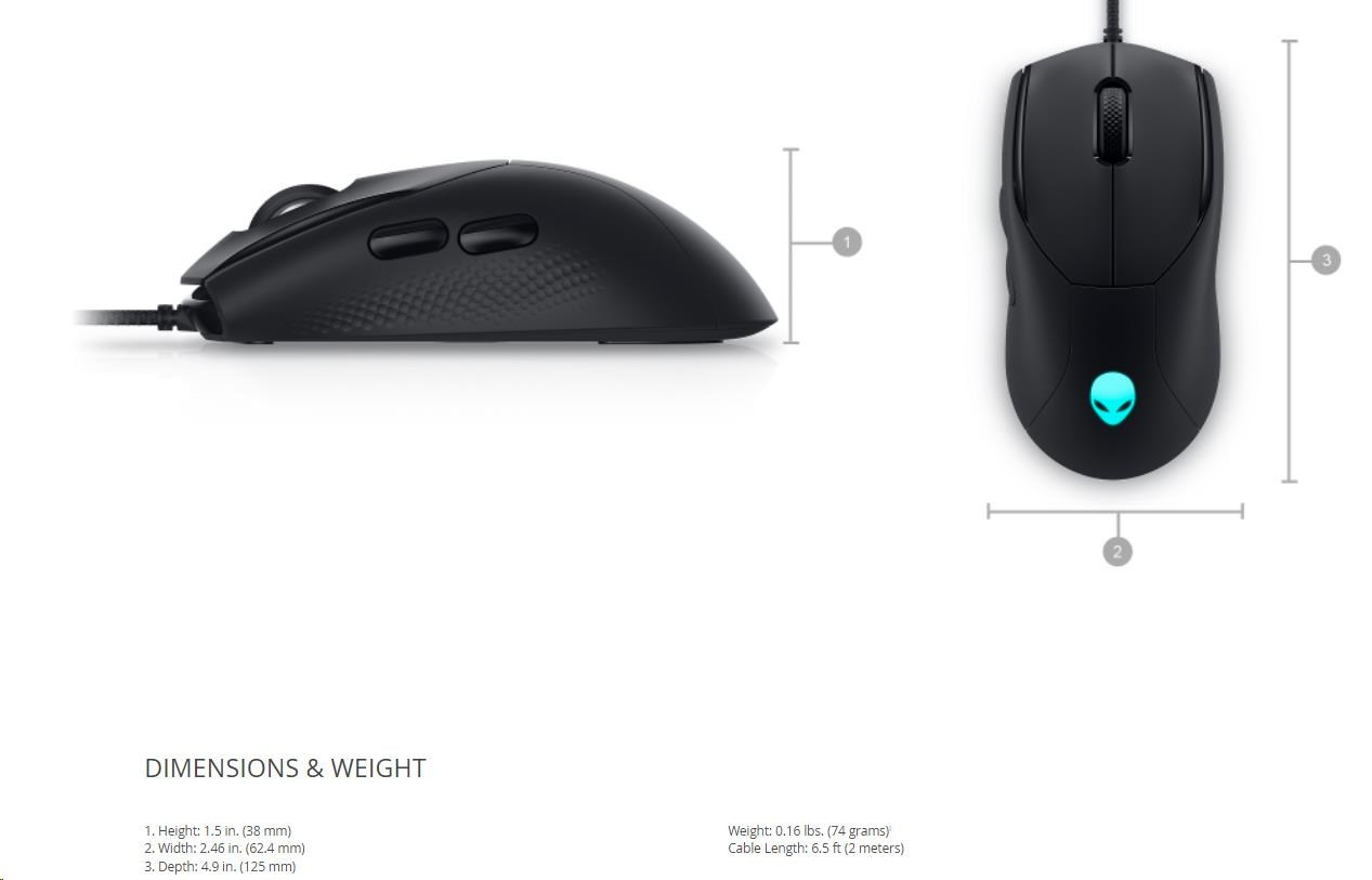 | Auto-calibration, 6 programmable buttons, 5 on-the-fly DPI settings, 16.8 million AlienFX lighting, 60 million clicks |