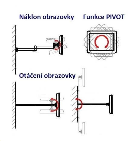 Profesionální držák na Tv monitory 15-43", VESA standard 75x75 a 100x100, otočný +/-90°, sklopný +10°/-50°, nastavení vzdálenosti od zdi 9-60cm, rotace pivot, profesionální držák, nosnost 15kg.Více