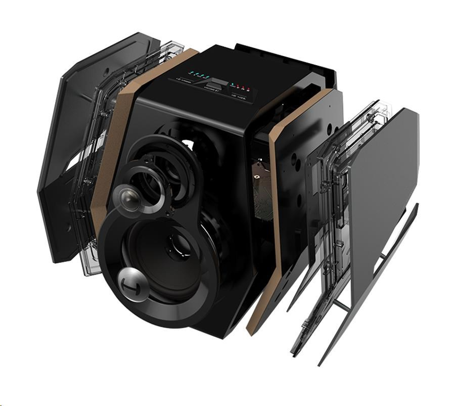 Sloučením dřevěné reproduktorové skříně s hliníkovými bočními panely, umožnili designéři zabudování špiščkovému osvětlení RGB, a vytvořili tak jedinečný vzhled.