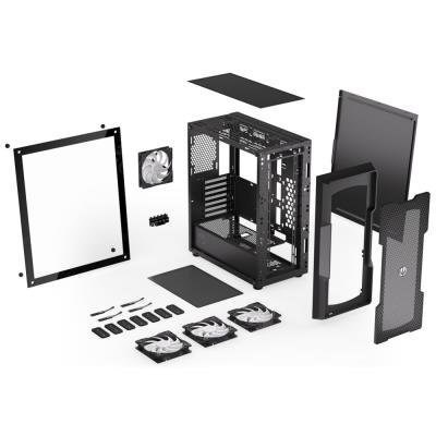 Akční nabídky na váš e-mailSkříň formátu Middle Tower s průhlednou bočnicí z tvrzeného skla nabízí dvě 2,5" pozice pro SSD disky a dvě 3,5" pozice pro pevné disky. Na horní části se nachází dva USB 3.0 porty, sluchátkový výstup a audio vstup pro mikrofon. Vybavena je čtyřmi 120 mm ventilátory s ARGB podsvícením, které spolu s perforovaným čelním panelem zajišťují dostatečné proudění vzduchu. Důmyslné řešení umožňuje pohodlné umístění až 360 mm dlouhého výměníku vodního chlazení na přední straně. Ve skříni je dostatek prostoru pro chladič CPU do výšky až 162 mm a grafickou kartu o délce až 370 mm. Dodávána je bez zdroje. Součástí je také interní ARGB ovladač a sada prachových filtrů.