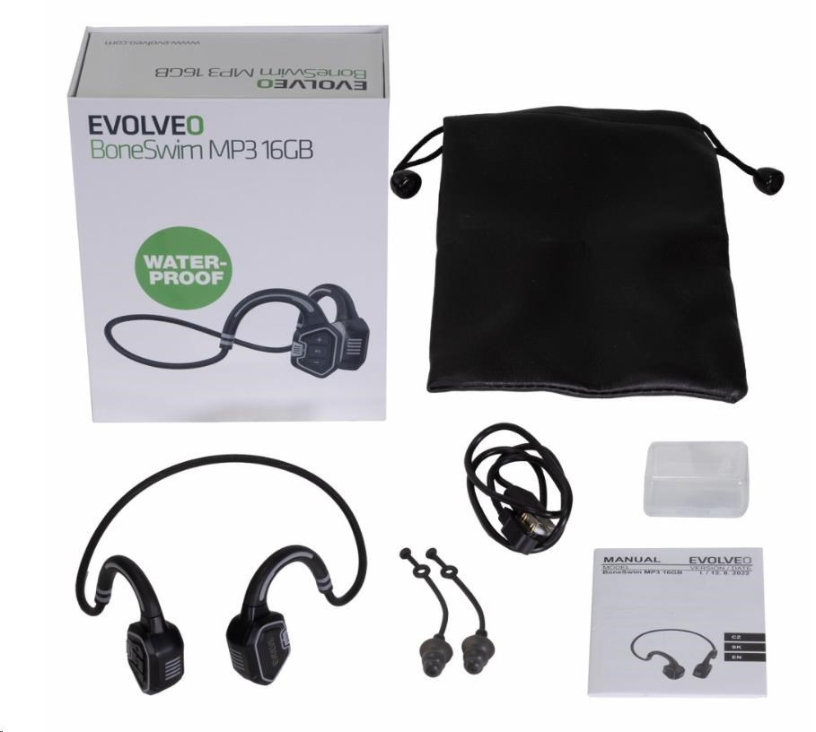 | Obsah balení | EVOLVEO BoneSwim MP3 sluchátka Ochranný přenosný obal Magnetický napájecí kabel Ucpávky do uší v krabičce + uchycení Uživatelský manuál |
