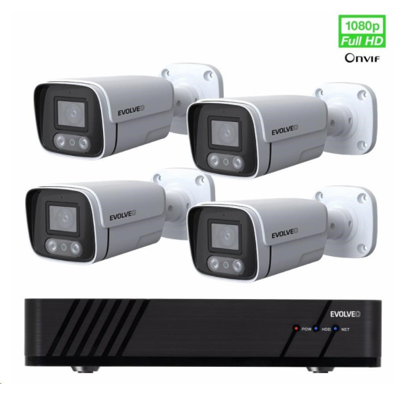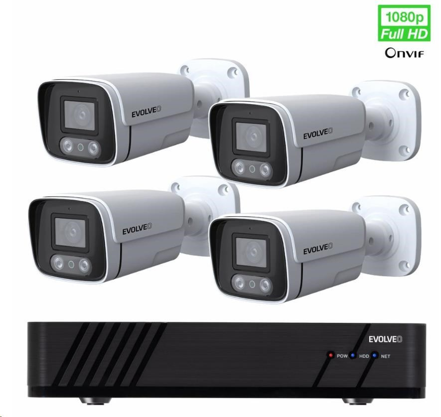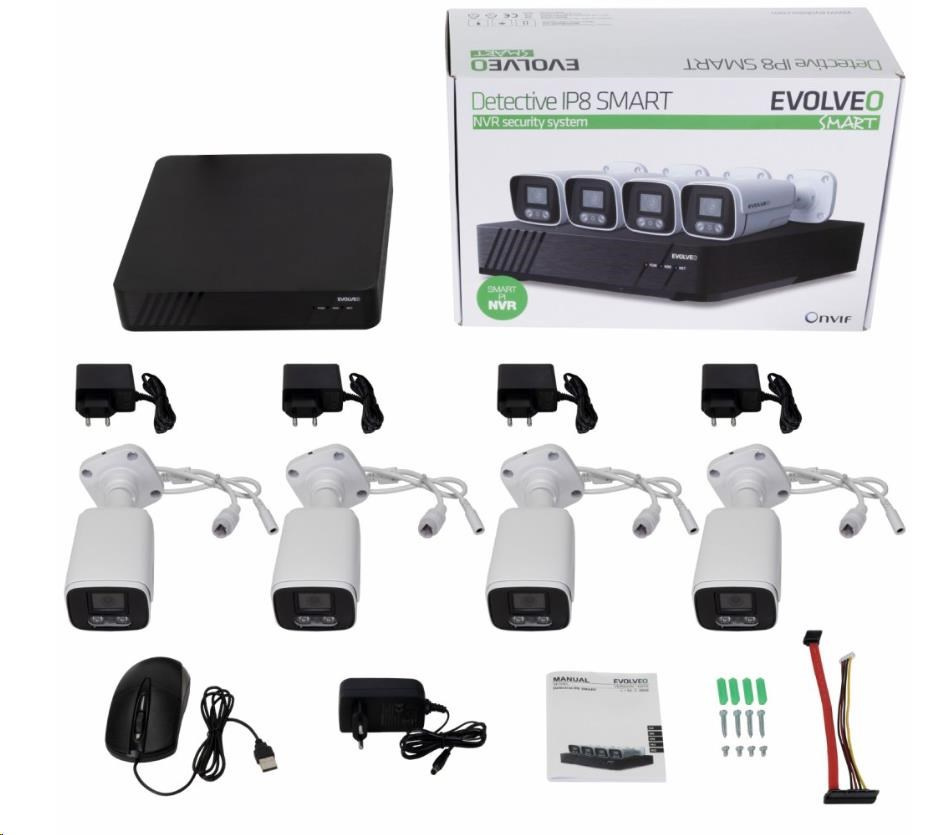 | Ostatní | Smartlife (Tuya) aplikace v CZ pro iOS a Android iCMS Program pro OS Windows Podpora Onvif protokolu Rozeznání pohybu z obrazu Možnost rozšíření o Antivandal kameru, nebo wifi kameru z nabídky EVOLVEO Podpora USB myši (myš v balení) 8 kanálový Full HD rekordér NVR s IP připojením kamer v lokální síti 4× venkovní celokovová kamera s napájecím adaptérem Mikrofon pro záznam zvuku 1/2,9" 2Mp CMOS snímač |