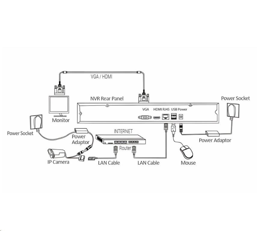 | Obsah balení | NVR jednotka s 8 kanály, SATA připojením pro až 8TB disk 4x IP Bullet IP66 kamera s nočním přísvitem 1x napájecí adaptér DC 12V 2A pro NVR 4x napájecí adaptér DC 12V 1A pro kamery 4x sada pro upevnění kamery 4x bajonetová těsnící krytka pro RJ45 konektor 1xUSB myš 1xSATA kabel pro připojení HDD 1x Uživatelský manuál |