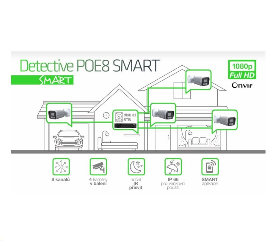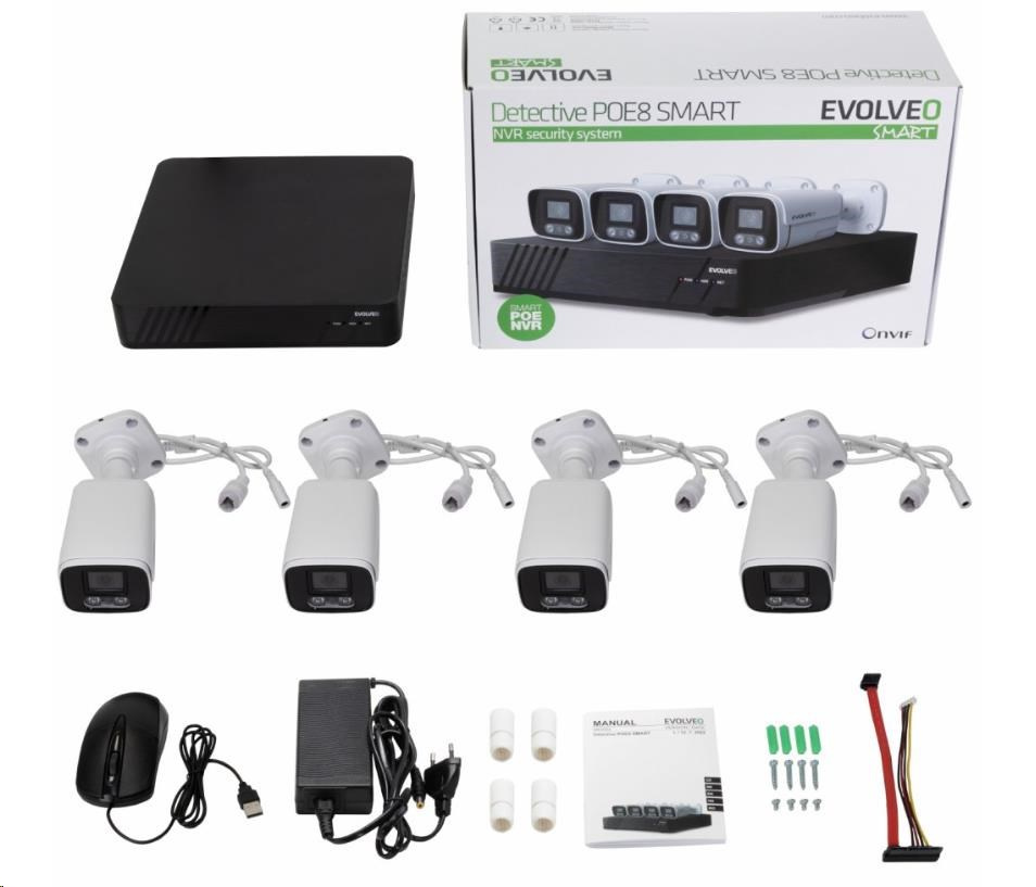 Akční nabídky na váš e-mail8 kanálový kamerový systém EVOLVEO Detective POE8 SMART je ideální řešení pro monitorování a bezpečnost vašeho domu, kanceláří, skladu nebo firmy. Jedná se o kompaktní kamerový systém, který využívá POE napájení kamer, není tedy nutné mít u každé kamery ještě zásuvku pro napájecí adaptér. UTP Kabel opatřený RJ45 konektorem na obou koncích, se postará jak o napájení kamery, tak i přenos signálů z NVR jednotky až ke kamerám. Jeho čistý obraz jak ve dne tak v noci využijete pro ochranu a monitorování nejen vaše rodinného domku nebo firmy, ale i pro dozor nad prodejnou nebo pro dohled nad veřejným prostranstvím. Veškeré nahrané události se nahrávají přímo na pevný disk, který vložíte do hlavní jednotky, a tak máte vaše data plně pod kontrolou. K záznamu máte přístup pomocí mobilní aplikace, nebo iCMS programu pro OS WIndows. Záznam lze také prohlížet na monitoru připojeném přímo do NVR jednotky pomocí HDMI nebo VGA kabelu.