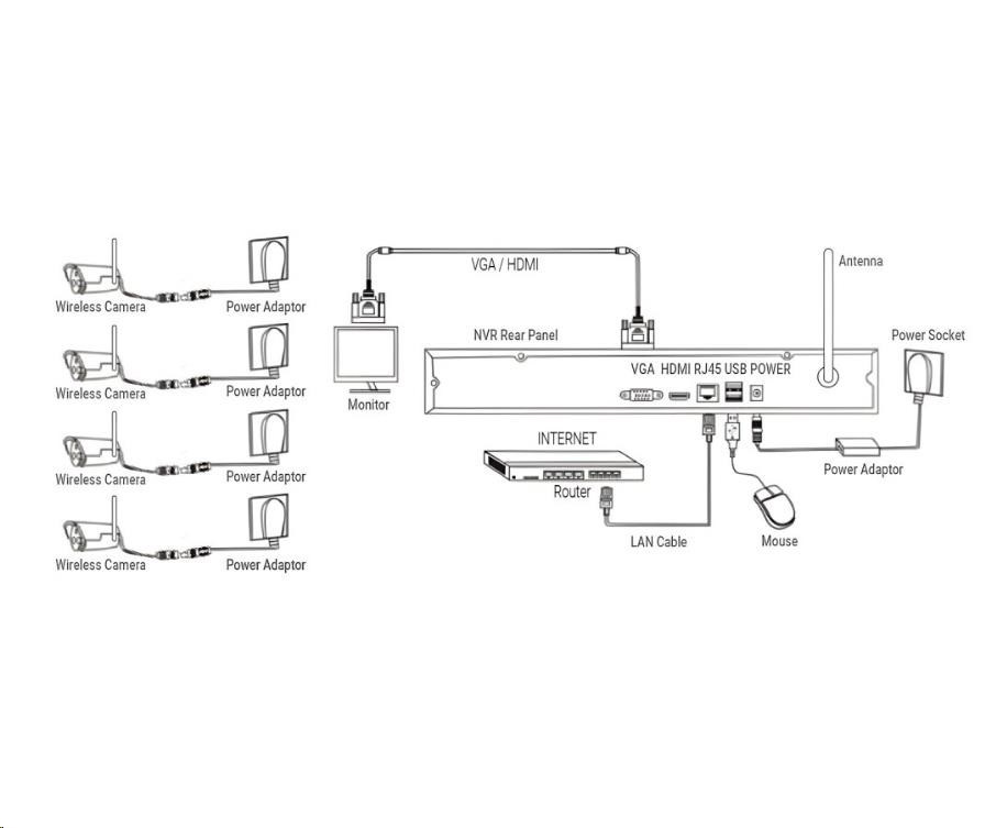 | Obsah balení | NVR jednotka s 8 kanály, SATA připojením pro až 8TB disk 4x Bezdrátová Bullet IP66 kamera s nočním přísvitem 4x Anténa pro bezdrátovou kameru 2,4G 5db 1x napájecí adaptér DC 12V 2A pro NVR 4x napájecí adaptér pro kamery 4x sada pro upevnění kamery 4x bajonetová těsnící krytka pro RJ45 konektor 1x Anténa pro NVR jednotku 1xUSB myš 1xSATA kabel pro připojení HDD 1x Uživatelský manuál |