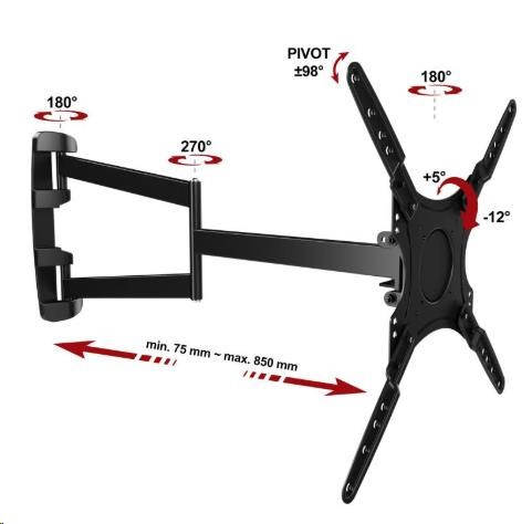 Extra dlouhý držák Tv ErgoSolid Longo85 Otočný, sklopný, délkově nastavitelný držák na Tv 26-60", funkce pivot, nosnost 30kg Nejdelší držák Tv nebo monitoru na trhu za dostupnou cenu! Potřebujete otočit televizi s úhlopříčkou 60" kolmo ke zdi? V tom případě potřebujete opravdu dlouhý držák s délkou minimálně 75cm. My vám nabízíme držák s délkou až 85cm za cenu držáků s délkou 65cm - ErgoSolid Longo85. Tento vynikající držák má unikátní konstrukci, která umožňuje délkové nastavení 75mm až 850mm. Díky tomu otočíte kolmo ke zdi i televizory s úhlopříčkou 60". Držák umožňuje i náklon obrazovky v rozmezí +5° až -12° a podporuje VESA standardy 75x75 až 400x400. Zvládne zatížení až 30kg i při maximálním vysunutí. Navíc tento držák má i funkci PIVOT - možnost otočení obrazovky z horizontální do vertikální polohy. Nejdelší držák na televize a monitory za skvělou cenu - ErgoSolid Longo85 Technické údaje: nosnost 30kg podpora VESA standardu 75x75 až 400x400 vhodný na televize i monitory s úhlopříčkou 26" až 60" nastavitelná vzdálenost od zdi v unikátním rozsahu minimální vzdálenost 75mm maximální vzdálenost 850mm možnost náklonu obrazovky v rozsahu +5° až -12° funkce PIVOT - možnost otočení Tv z horizontální polohy do vertikální korekce roviny obrazovky i po montáži konstrukce špičkové kvality materiál ocel, výborné zpracování instalační materiál součástí balení barevné provedení černé záruka 3 roky Nejdelší držák na televizi, otočení televize kolmo ke zdi, funkce pivot, TOP kvalita - Ergosolid Longo85 Velmi dlouhý držák na televizi monitor, délka 75mm až 850mm, nosnost 30kg, na televize 26 až 60 palců - ErgoSolid Longo85 Nejdelší držák Tv ErgoSolid Longo85 podporuje VESA standardy: VESA 75x75 VESA 100x100 VESA 200x100 a 100x200 (u VESA 100x200 není možné využít funkci PIVOT) VESA 200x200 VESA 300x300 VESA 400x400.