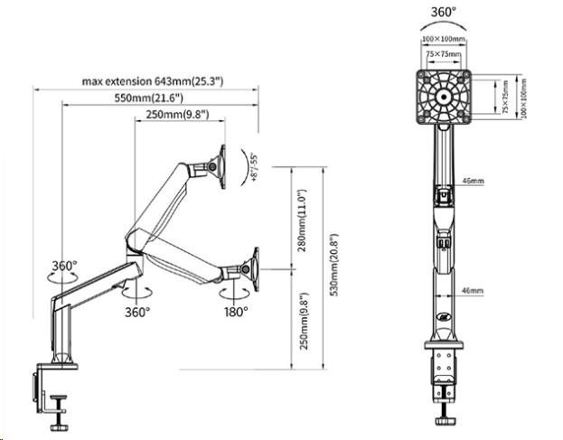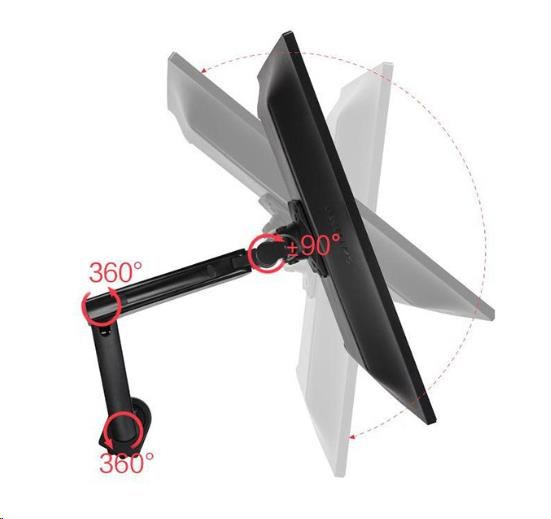 Profesionální stolový plně polohovatelný držák na monitory a televizory s úhlopříčkou 17-32" Nabízíme Vám špičkový držák na televizi nebo monitor s uchycením na stolovou desku, který je plně polohovatelný - otáčení do stran, nastavení náklonu, výšky a vzdálenosti od uchycení, otáčení obrazovky do horizontální nebo vertikální polohy. Držák je ideální pro zavěšení všech typů televizorů a monitorů s úhlopříčkou 17-32" a hmotností maximálně 8kg. Nastavení výšky umožňuje plynová pružina, kterou snadno nastavíte na hmotnost 2-8kg. Polohování obrazovky je velmi snadné a příjemné, zvládnou to i děti. Držák má systém pro vedení kabeláže a připojení USB portů. Barevné provedení černé. Záruka 3 roky. Technické údaje: nosnost 8kg minimální zatížení 2kg držák podporuje VESA standardy 75x75 a 100x100 možnost zakoupení rozšíření na VESA 200x100 nebo 200x200 ideální pro zavěšení monitorů a televizorů s úhlopříčkou 17-32" otáčení do stran +/- 180° náklon + 55° až - 8° funkce PIVOT - otočení obrazovky na délku nebo na výšku (horizontálně nebo vertikálně) nastavení vzdálenosti od uchycení na stolovou desku max. 643mm výškové polohování 280mm minimální výška od stolu 250mm maximální výška od stolu 530mm systém vedení kabeláže 2x USB port 2 typy uchycení na stolovou desku (na okraj, do prostoru) uchycení na stolové desky o síle 10-95mm profesionální kvalita barevné provedení černé záruka 3 roky.