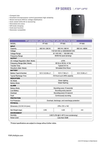 FP série UPS FSP/Fortron nemá možnost komunikace s PC (není obsažen USB ani RS-232 komunikační port). V případě požadavku na komunikační port použijte UPS z řady EP série.
