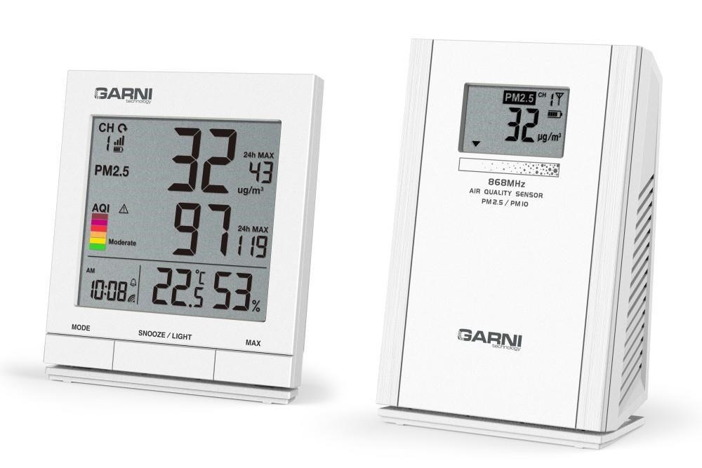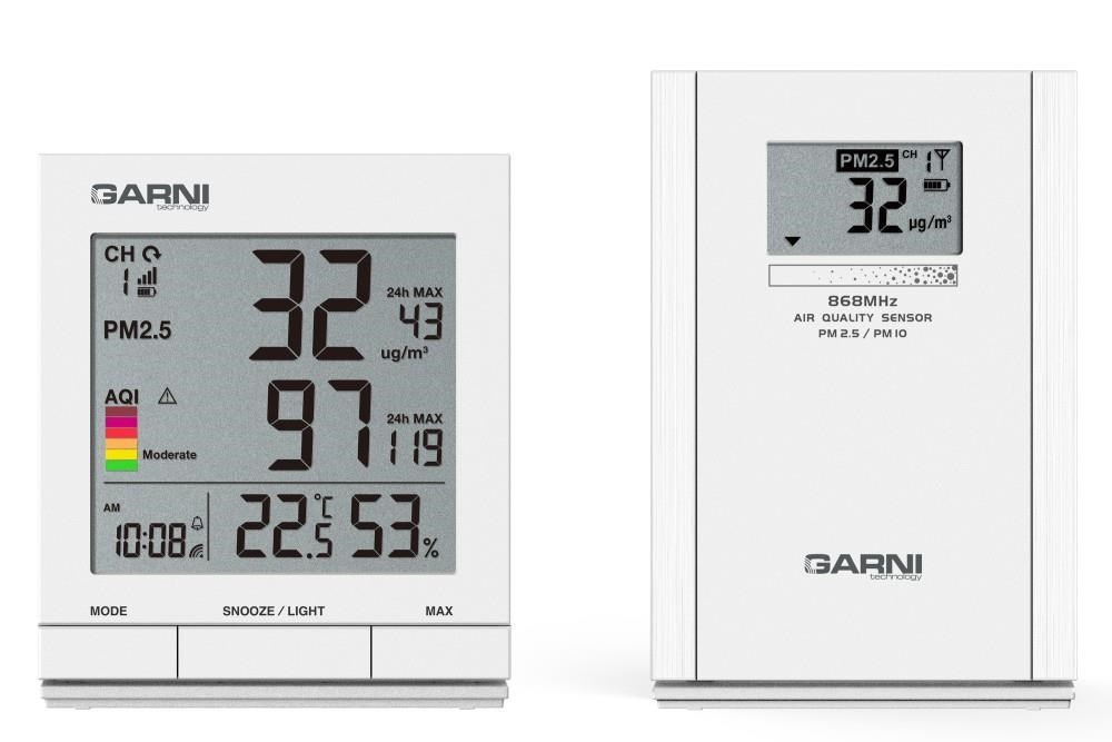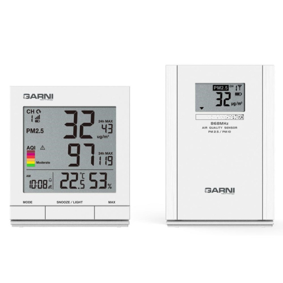 Měřič kvality vzduchu GARNI 204 OneCare je určen pro vnitřní použití. Měří a zobrazuje na svém LCD displeji hodnoty kvality vzduchu – koncentraci pevných částic PM2.5 a PM10 naměřenou bezdrátovým čidlem GARNI 104Q (jedno bezdrátové čidlo je součástí balení) a také teplotu a relativní vlhkost. Pro měření pevných částic (PM) je použito švýcarské čidlo SENSIRION řady SPS ? měření pevných částic (PM) PM2.5 a PM10 bezdrátovým čidlem GARNI 104Q ? hlavní jednotka měří teplotu a relativní vlhkost a zobrazuje hodnoty pevných částic PM2.5, nebo PM10 naměřené bezdrátovým čidlem GARNI 104Q ? pro měření pevných částic jsou použita přesná švýcarská čidla SENSIRION řady SPS ? jednotkou PM jsou µg/m3 ? přehledný LCD displej hlavní jednotky o rozměrech 69 x 64 mm ? velikost číslic na displeji – čas 6,5 mm, teplota, relativní vlhkost 12 mm, aktuální hodnota PM2.5, PM10 17 mm, maximální hodnota 7 mm, aktuální hodnota AQI 17 mm, maximální hodnota 7 mm ? zobrazení aktuálních hodnot PM2.5, PM10 a AQI, nebo průměrných hodnot naměřených za 24 hodin ? indikace kvality vzduchu barevnou stupnicí AQI (Air Quality Index) a číselnou hodnotou AQI ? paměť na maximální hodnotu PM2.5, PM10 a AQI od posledního vymazání paměti, za poslední hodinu a posledních 24 hodinalarm AQI upozorní na vysokou úroveň AQI na základě aktuálně naměřené hodnoty AQI nebo průměrné hodnoty za posledních 24 hodin. Jakmile je dosaženo hodnoty, která byla nastavena, aktivuje se zvukové znamení a na displeji hlavní jednotky začne blikat ikona alarmu ? možnost použití až 4 bezdrátových čidel GARNI 104Q ? při použití více bezdrátových čidel GARNI 104Q možnost automatického přepínání kanálů ? ikona signálu bezdrátových čidel ? čas řízený rádiovým signálem DCF-77 s možností manuálního nastavení ? ikona příjmu signálu DCF-77 ? 12, nebo 24 hodinový formát zobrazení času ? časová zóna -23 až +23 hodin ? zobrazení tepoty ve C, nebo F ? automatické přepínání letního a zimního času ? aktualizace naměřených hodnot - 60 sekund ? budík s funkcí Snooze (posunutí buzení o 5 minut) ? možnost krátkodobého osvětlení displeje na 9 sekund ? ikona slabých baterií ? napájení na baterie Bezdrátové čidlo GARNI 104Q ? pro vnitřní použití ? displej o rozměrech 37 x 21 mm ? velikost číslic 10 mm ? zobrazení hodnoty kvality vzduchu PM2.5, nebo PM10 ? 4 kanály ? zobrazení čísla kanálu, ikony slabých baterií, ikony vysílání a nabíjení na displeji ? vizualizace kvality vzduchu hodnotou koncentrace na šestiúrovňové stupnici ? aktualizace a přenos naměřené hodnoty kvality vzduchu při napájení USB adaptérem každých 60 sekund ? při napájení bateriemi měří bezdrátové čidlo GARNI 104Q ve výchozím nastavení koncentraci PM2.5 a PM10 automaticky každých 10 minut. Pro maximalizaci výdrže baterií lze změnit interval měření z 10 minut na 20 nebo 30 minut ? dosah signálu až 100 m v otevřeném prostoru ? frekvence přenosu 868 MHz ? napájení 3 x 1.2V NiMH nabíjecí baterie typu AA, nebo přes USB adaptér (adaptér není součástí balení) , nabíjení přes USB (5V/1A) Obsah balení 1 x hlavní jednotka 1 x bezdrátové čidlo GARNI 104Q 3 ks nabíjecích baterií typ AA, 1,2 V, Ni-MH, 2000 mAh 1 x USB kabel 120 cm CZ, SK, EN návod, QR kód s odkazem ke stažení návodů DE, NL, PL, HU.