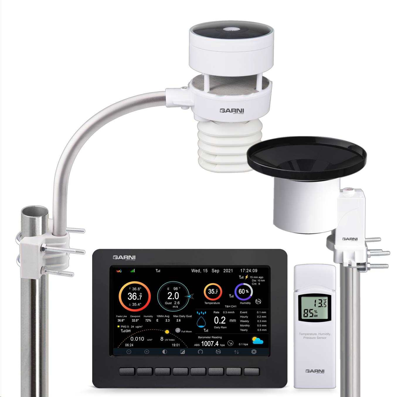 – integrovaného čidla 6-v-1 GARNI 095HA s ultrazvukovým anemometrem vestavěným solárním panelem a