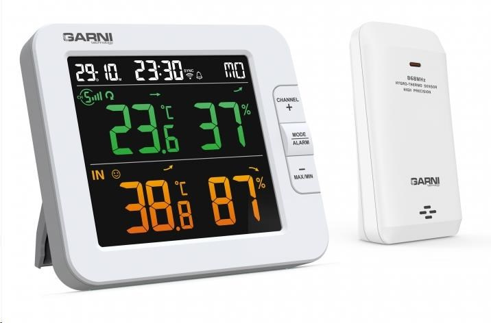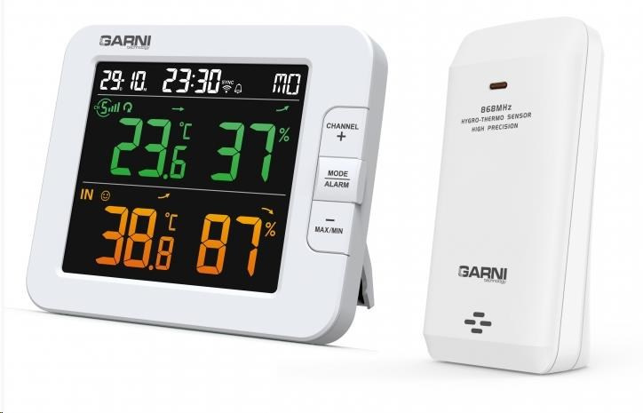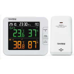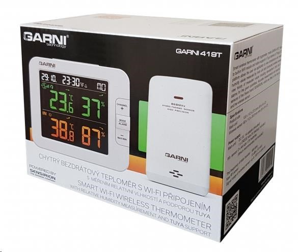 Chytrý vícekanálový teploměr s vlhkoměrem, model GARNI 419T má vestavěný modul WiFi a prostřednictvím svého chytrého systému je kompatibilní s platformou Tuya IOT. Pomocí aplikace Tuya Smart můžete sledovat teplotu a relativní vlhkost hlavní jednotky a bezdrátových čidel, kontrolovat historii záznamů, nastavovat alarmy pro dané veličiny, spouštět pokročilé funkce za pomocí naměřených hodnot a naměřená data odeslat na email v Excel souboru. Je možné jej propojit s dalšími produkty chytré domácnosti, ovládání pak probíhá přes aplikaci v mobilním zařízení. Hlavní jednotka i bezdrátové čidlo jsou osazeny švýcarskými čidly SENSIRION. TUYA spolupracuje s platformou pro chytrou domácnost Tuya připojení k místní Wi-Fi síti 2,4 GHz spolupracuje s aplikací Tuya Smart jazykové mutace aplikace - čeština, slovenština, angličtina barevný inverzní LCD displej o rozměrech 90 x 81 mm stále osvětlený displej, 2 stupně jasu, nastavení kontrastu v 15 úrovních velikost číslic na displeji – čas 9 mm, datum, zkratka názvu dne 7,5 mm, teplota 21,5 mm, relativní vlhkost 21 mm barvy na displeji – čas, datum, zkratka názvu dne bílá, vnitřní teplota a rel. vlhkost oranžová, vnější teplota a rel. vlhkost zelená měření vnitřní a vnější teploty a relativní vlhkosti zobrazení teploty ve °C, nebo °F švýcarská čidla SENSIRION možnost použití až 7 bezdrátových čidel (GARNI 055H, bazénové čidlo GARNI 057P) indikace vnitřní tepelné pohody 3 ikonami možnost kalibrace teploty a rel. vlhkosti vnitřní a na jednotlivých kanálech bezdrátový přenos hodnot vnější teploty a relativní vlhkosti na frekvenci 868 MHz ikona síly signálu z bezdrátových čidel ikona připojení k místní Wi-Fi síti paměť na maximální a minimální naměřené denní a celkové hodnoty teploty a relativní vlhkosti šipka vývoje teploty a rel. vlhkosti čas a datum řízené z Internetu s možností manuálního nastavení budík s možností opakovaného buzení (Snooze) po 5 minutách budící signál - 4 sekundy 1 pípnutí za sekundu, 4 sekundy 2 pípnutí za sekundu, 4 sekundy 3 pípnutí za sekundu a poté stále 4 pípnutí za sekundu ikona slabých baterií možnost aktualizace firmware barva hlavní jednotky bílá napájení síťovým adaptérem a záložní baterií možnost postavení a zavěšení Bezdrátové čidlo GARNI 055H vlhkosti odolné měření teploty a relativní vlhkosti švýcarská čidla SENSIRION 7 kanálů možnost postavení a zavěšení barva bílá možnost postavení a zavěšení napájení bateriemi 2 ks typ AA (tužkové, nejsou součástí dodávky) Obsah balení hlavní jednotka 1 ks bezdrátové čidlo GARNI 055H síítový adaptér návod CZ, SK, EN. DE, PL, HU, NL.