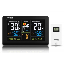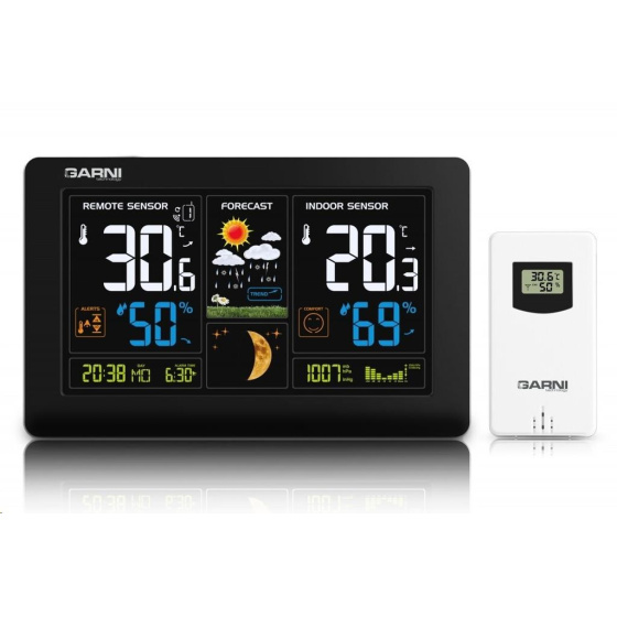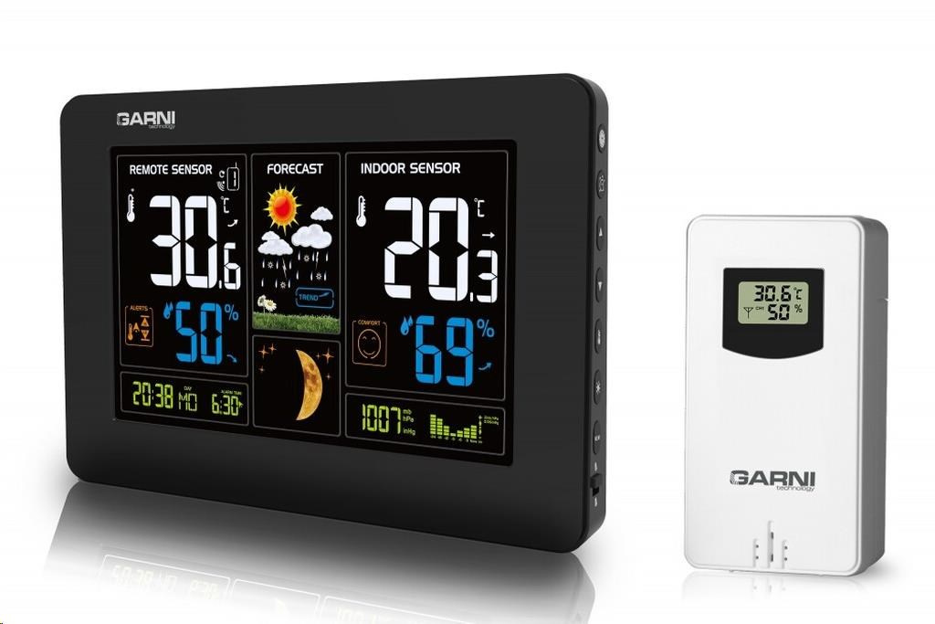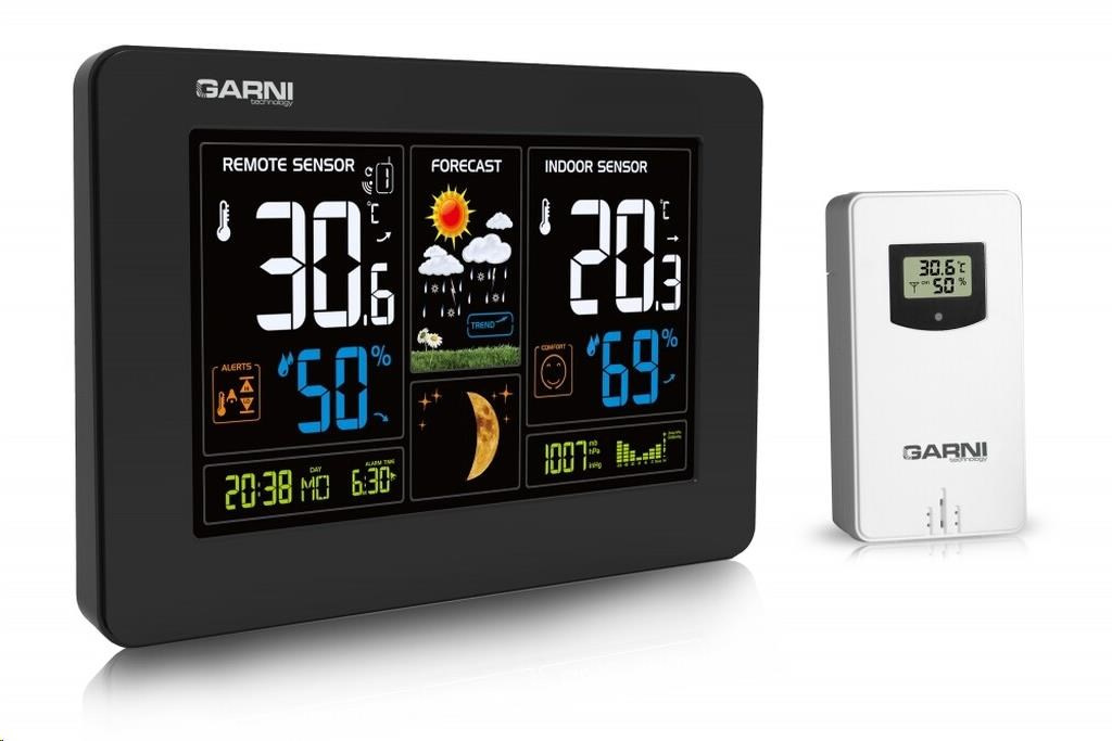Meteorologická stanice se špičkovým inverzním barevným VA displejem s časem řízeným rádiovým signálem DCF-77, budíkem, měřením vnitřní teploty, relativní vlhkosti a absolutního barometrického tlaku, bezdrátovým čidlem pro měření vnější teploty a relativní vlhkosti a USB portem pro nabíjení externích zařízení inverzní barevný VA displej o rozměrech 167 x 93 mm s možností stálého osvětlení při napájení síťovým adaptérem, nebo krátkodobým osvětlením na 15 s při napájení bateriemi 4 stupně jasu osvětlení displeje, možnost vypnutí osvětlení displeje s možností krátkodobého osvětlení na 15 s (při napájení síťovým adaptérem) velikost číslic na displeji – čas, datum, barometrický tlak 8 mm, zkratka názvu dne 6 mm, vnitřní a vnější teplota 30 mm, vnitřní a vnější relativní vlhkost 20 mm čas a datum řízené signálem DCF-77 s možností manuálního nastavení ikona příjmu signálu DCF-77 zkratka názvu dne 12ti, nebo 24 hodinový formát zobrazení času možnost nastavení časového pásma od -12 do +12 hodin budík s funkcí opakovaného buzení (Snooze) po 5 minutách budící signál - 10 sekund 1 pípnutí za sekundu, 10 sekund 2 pípnutí za sekundu, 10 sekund 4 pípnutí za sekundu a poté stále 8 pípnutí za sekundu 6 animovaných ikon předpovědi počasí (slunečno, polojasno, oblačno, srážky, silný déšť a sněžení) na základě sledování barometrického tlaku vestavěným barometrickým čidlem zobrazení hodnot vnitřní a vnější teploty a relativní vlhkosti paměť na maximální a minimální naměřené hodnoty teploty a rel. vlhkosti s automatickým mazáním v 0:00 hodin měření absolutního barometrického tlaku (mb / hPa nebo inHg) šipky tendence vývoje absolutního barometrického tlaku, vnitřní a vnější teploty a rel. vlhkosti možnost nastavení alarmu horní a dolní meze venkovní teploty v rozsahu od -20°C do +60°C (akustickým signálem a ikonou na displeji) pro každý kanál zvlášť s indikací námrazy v rozsahu od -1°C do +3°C zobrazení teploty ve °C, nebo °F možnost použití až 3 bezdrátových čidel GARNI 30H (jedno čidlo GARNI 030H je součástí dodávky) funkce automatického přepínání kanálů 5 ikon vnitřní tepelné pohody bezdrátový přenos hodnot vnější teploty a relativní vlhkosti na frekvenci 433 MHz ikona příjmu signálu bezdrátového čidla zobrazení fáze Měsíce USB port pro nabíjení mobilních zařízení (pouze při napájení hlavní jednotky síťovým adaptérem), maximální nabíjecí proud 1 000 mA ikony slabých baterií napájení síťovým adaptérem nebo bateriemi možnost postavení, nebo zavěšení barva černá Bezdrátové čidlo GARNI 030H vlhkosti odolné displej o rozměrech 19 x 11 mm velikost číslic na displeji: teplota a relativní vlhkost 4 mm měření teploty a relativní vlhkosti 3 kanály maximální RF výkon 10 dBm (10 mW) možnost postavení a zavěšení barva bílá Obsah balení: 1 x hlavní jednotka GARNI 545 Line 1 x bezdrátové čidlo GARNI 030H 1 x síťový adaptér český, slovenský, německý, anglický, italský, polský a maďarský návod.