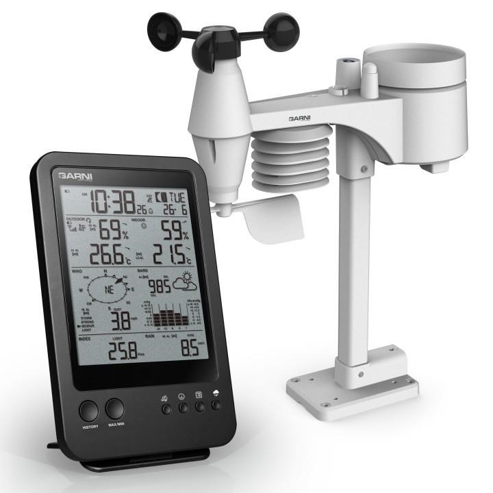 Meteorologická stanice s předpovědí počasí, měřením vnitřní a vnější teploty, relativní vlhkosti, barometrického tlaku, rychlosti a směru větru, dešťových srážek, UV indexu a intenzity slunečního záření ? LCD displej o rozměrech 90 x 110 mm ? možnost krátkodobého osvětlení displeje oranžovou barvou na 5 s ? velikost číslic na displeji - čas 15 mm, datum, zkratka názvu dne 6,5 mm, vnější a vnitřní teplota a relativní vlhkost 12,5 mm, barometrický tlak 8 mm, rychlost a náraz větru 11 mm, zkratka směru větru 5 mm, srážky, UV index, intenzita slunečního záření, pocitová teplota, Wind Chill, teplotní index, rosný bod 10 mm ? čas a datum řízený rádiovým signálem DCF-77 s možností manuálního nastavení ? zkratka názvu dne ? 12, nebo 24 hodinový formát zobrazení času ? ikona příjmu signálu DCF-77 ? časová zóna +/- 23 hodin ? budík s funkcí opakovaného buzení (Snooze) ? buzení zvukovým signálem (4 sekundy 1 pípnutí za sekundu, 4 sekundy 2 pípnutí za sekundu, 4 sekundy 3 pípnutí za sekundu a poté stálé 4 pípnutí za sekundu) ? funkce budíku Pre-alarm - budík se aktivuje o 30 minut dříve, pokud bude venkovní teplota nižší než -3 C ? fáze Měsíce ? měření vnitřní teploty a relativní vlhkosti s ikonou tepelné pohody ? měření vnější teploty, relativní vlhkosti, rychlosti a směru větru, srážek, UV indexu a intenzity slunečního záření integrovaným čidlem 7-v-1 ? integrované čidlo 7-v-1 používá pro měření teploty a relativní vlhkosti švýcarská čidla SENSIRION ? možnost použití dalších 3 bezdrátových čidel pro měření teploty a relativní vlhkosti GARNI 055H a bazénového čidla GARNI 057P pro měření teploty vody (volitelné příslušenství) ? zobrazení teploty ve C, nebo F ? šipky vývoje vnitřní a venkovní teploty a relativní vlhkosti ? možnost automatického střídání zobrazení venkovní teploty a relativní vlhkosti naměřené integrovaným čidlem 7-v-1 a volitelnými přihlášenými bezdrátovými čidly po 4 sekundách ? měření průměrné rychlosti větru za uplynulých 12 s, nárazů větru a směru větru aktuální a za uplynulých 5 minut, 16 rozlišení směru ? zobrazení rychlosti větru v Beaufortově stupnici ? textový popis úrovně síly větru (LIGHT – lehká, MODERATE – mírná, STRONG – silná, STORM – bouře) ? zobrazení rychlosti větru a nárazu větru v m/s, km/h, knots (uzlech), nebo mph ? zobrazení směru větru zkratkou (16 zkratek), nebo ve stupních (360 ) ? měření dešťových srážek - aktuální (za uplynulou hodinu), hodinový úhrn, denní úhrn, týdenní úhrn, měsíční úhrn a celkový úhrn ? zobrazení úhrnu dešťových srážek v mm, nebo in (palcích), aktuální hodnota v mm/h, in/h ? 6 animovaných ikon předpovědi počasí (slunečno, polojasno, oblačno, déšť, bouřky, sněžení) ? měření barometrického tlaku, zobrazení absolutního, nebo relativního barometrického tlaku ? zobrazení hodnoty barometrického tlaku v hPa, inHg, nebo mmHg ? sloupcový graf vývoje barometrického tlaku za uplynulých 24 hodin ? zobrazení hodnoty UV indexu, intenzity slunečního záření, venkovní pocitové teploty, Wind Chill, teplotního indexu a rosného bodu ? zobrazení intenzity slunečního záření v lux, fc, nebo W/m2 ? možnost kalibrace UV indexu a intenzity slunečního záření ? paměť na naměřené hodnoty vnitřní a venkovní teploty a vlhkosti, hodnoty barometrického tlaku, hodnoty Wind Chill, rychlost větru včetně času a data měření za posledních 24 hodin po hodině ? zobrazení maximálních a minimálních hodnot vnitřní a vnější teploty a relativní vlhkosti, pocitové teploty, Wind Chill, teplotního indexu, rosného bodu, barometrického tlaku, maximální průměrné rychlosti a nárazu větru a maximálních intenzity srážek, maximálního UV indexu, maximální hodnoty intenzity slunečního záření s časem a datem záznamu ? alarm horních a dolních mezí vnitřní a vnější teploty a relativní vlhkosti včetně přídavných čidel ? alarm horní meze hodinového úhrnu srážek ? alarm horní meze rychlosti větru ? indikace dosažení horní, nebo dolní meze zvukovým signálem a blikající ikonou ? indikace slabých baterií hlavní jednotky , integrovaného bezdrátového čidla 7-v-1 a dalších přídavných bezdrátových čidel ? indikace síly signálu integrovaného bezdrátového čidla a přídavných čidel ? barva černá ? rozměry hlavní jednotky bez stojánku 118 x 192,5 x 21 mm ? napájení 3 ks AA baterií 1,5 V Integrované bezdrátové čidlo 7-v-1 model GARNI 6INT ? voděodolné integrované bezdrátové čidlo 7-v-1 (teplota, relativní vlhkost, rychlost větru, směr větru, dešťové srážky, UV index, intenzita slunečního záření) ? dosah signálu integrovaného bezdrátového čidla až 150 m v otevřeném prostoru ? přenos signálu na frekvenci 868 MHz ? vodováha ? radiační štít ? barva světle šedá, misky rychlosti větru černé ? rozměry 343,5 x 393,5 x 136 mm ? napájení 3 ks AA baterií 1,5 V Obsah balení: 1 x hlavní jednotka 1 x integrované bezdrátové čidlo 7-v-1 1 x stojánek hlavní jednotky 1 x montážní základna integrovaného bezdrátového čidla 1 x stojánek integrovaného bezdrátového čidla 1 x montážní objímka integrovaného bezdrátového čidla 4 x delší šroub, 4 x matice, 4 x plochá podložka, 2 x kratší šroub, 2 x menší matice, 2 x gumové podložky český, slovenský, anglický, německý, nizozemský, polský a maďarský návod.