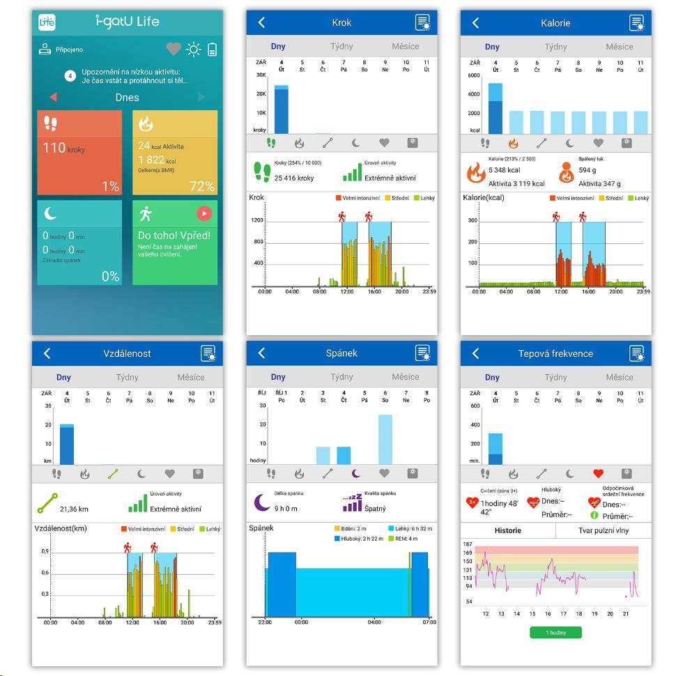 - na hlavní obrazovce aplikace je zobrazen přehled naměřených hodnot, jako je počet kroků, spálených kalorií, doba spánku, sportovní režim a aktuální tepová frekvence (pokud je měření aktivováno). Možnost měření tepové frekvence celý den i ve spánku. Kliknutím na jednotlivé položky zobrazíte podrobný graf (kromě měření tepové frekvence)