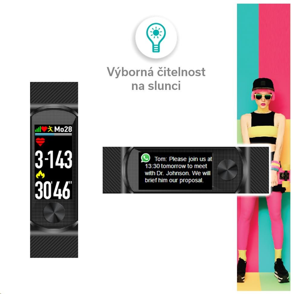 - zobrazení na náramku - datum, průběh plnění stanovených cílů, stav baterie, ikona aktuálního režimu, ikona zapnutého buzení, ikona připojení k mobilnímu zařízení aktuální čas, počet kroků, kalorie, tepová frekvence a dále ve sportovním režimu podle volby v aplikaci, až 8 zvolených údajů