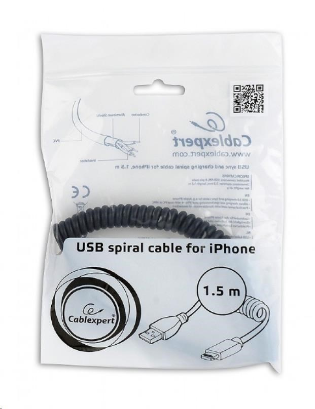 USB sync and charging spiral cable for iPhone, 1.5 m, black