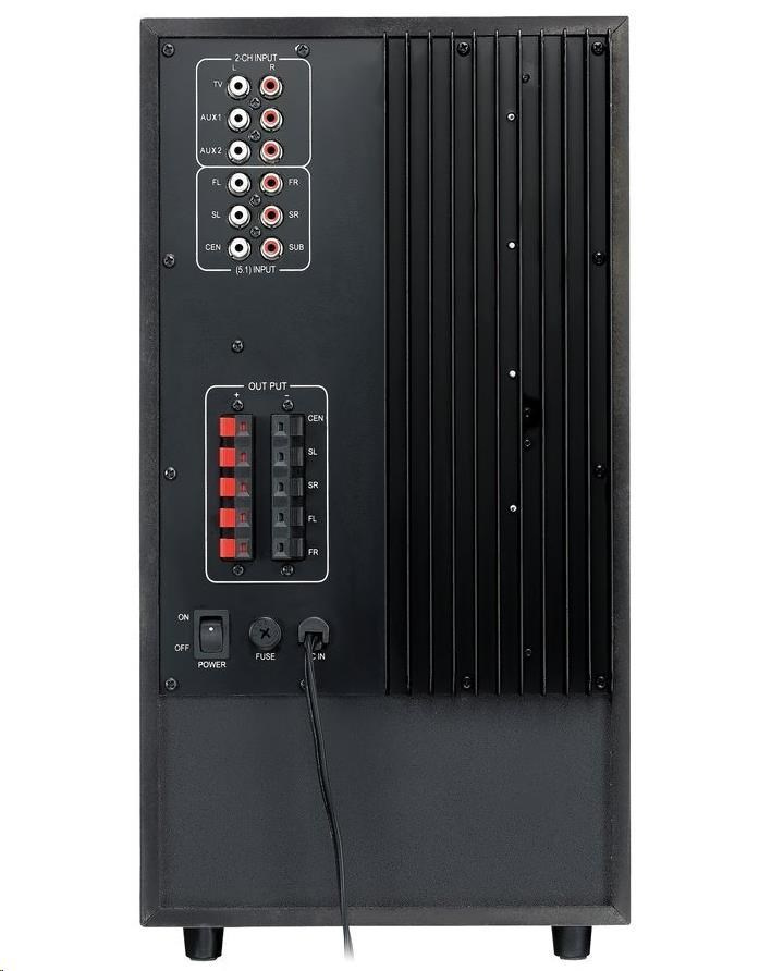 Systém reproduktorů v konfiguraci 5.1 nabízí celkový výkon 200 W. Sestava v dřevěném provedení je tvořena kvalitním subwooferem s 8" reproduktorem, který disponuje integrovaným zesilovačem a výkonem 75 W. Subwoofer je doplněn čtyřmi satelity a jedním středovým reproduktorem s výkonem 4 x 24 W + 1 x 30 W. Součástí balení je napájecí adaptér 100-240 V a dálkové ovládání.