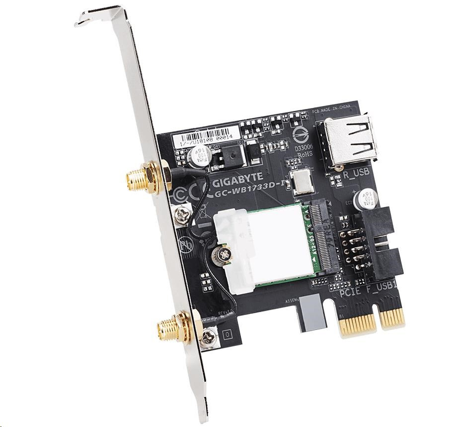 2x2 802.11ac Dual Band WIFI + BLUETOOTH 5 card GC-WB1733D-I is an exclusive PCIe expansion card that offers support for the latest 2x2 802.11ac 160MHz Dual Band WIFI and BLUETOOTH 5 connectivity.