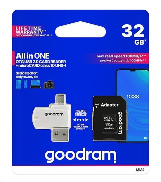 GOODRAM M1A4 All in One delivers versatility by providing functionality of few devices in one solution. It is a card reader equipped with USB 2.0 and micro USB connectors, allowing easy data transfer between computers, smartphones, tablets and cameras. It comes bundled with a fast UHS-I microCard.