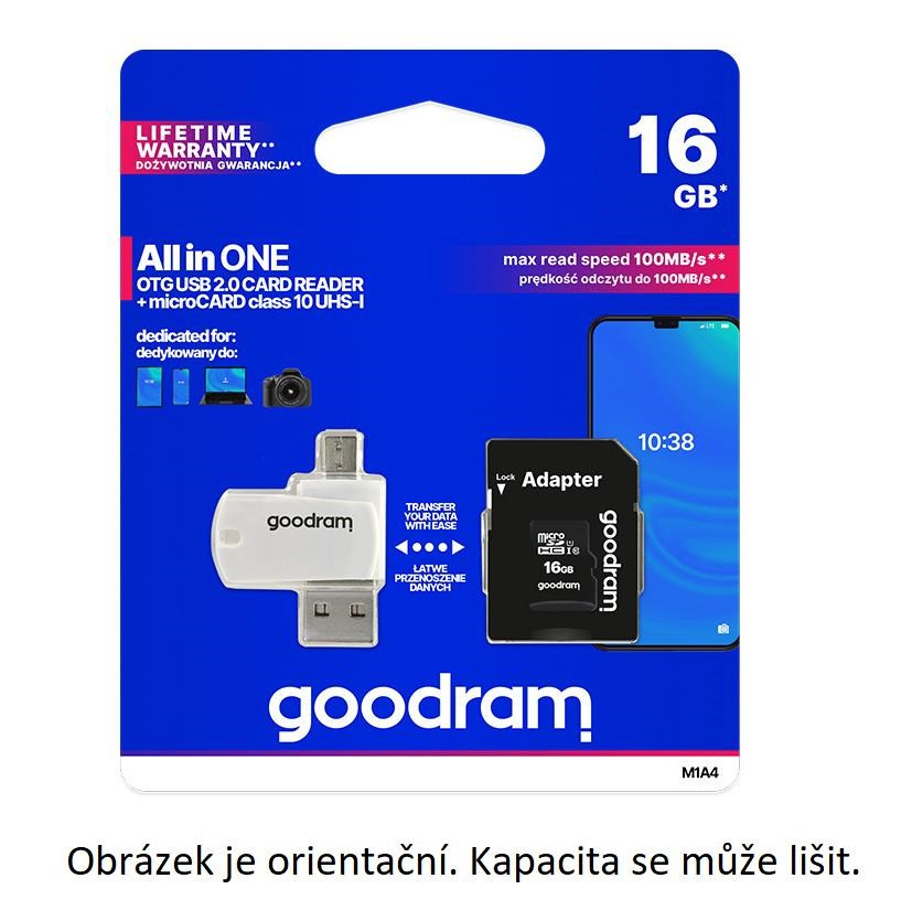 GOODRAM M1A4 All in One delivers versatility by providing functionality of few devices in one solution. It is a card reader equipped with USB 2.0 and micro USB connectors, allowing easy data transfer between computers, smartphones, tablets and cameras. It comes bundled with a fast UHS-I microCard.