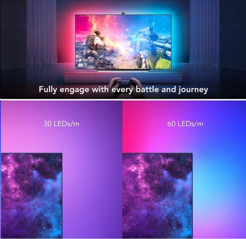 Akční nabídky na váš e-mailVylepšete své herní, filmové a hudební zážitky s živým chytrým osvětlením Govee DreamView T2. 16 milionů barev s více než 99 režimy efektů, z toho 4 režimy pro synchronizaci s hudbou, povznese zážitek ze sledování televize nebo hraní her na novou úroveň díky SMART technologii ColorMatch, která snímá obrazovku revoluční duální kamerou a automaticky podle toho upravuje nastavení světel. Ovládají se hlasem přes Siri, Amazon Alexa nebo Google Assistant, přes aplikaci nebo Control box. Nebudete proto ani muset stávat z gauče. Barevné podsvícení opticky zvětšuje obraz a také šetří vaše oči.