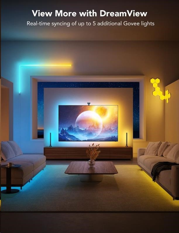 Speciální duální kamera s pokročilou technologií ColorMatch inteligentně rozpoznává a zachycuje barvy na obrazovce vaší televize nebo monitoru. Na základě této barevné analýzy automaticky vyhodnotí a nastaví ideální podsvícení. Užijte si synchronizaci barev bez zpoždění, aniž byste potřebovali HDMI kabel nebo byli omezováni streamovacími službami. Spolu lze spárovat až pět Govee zařízení.