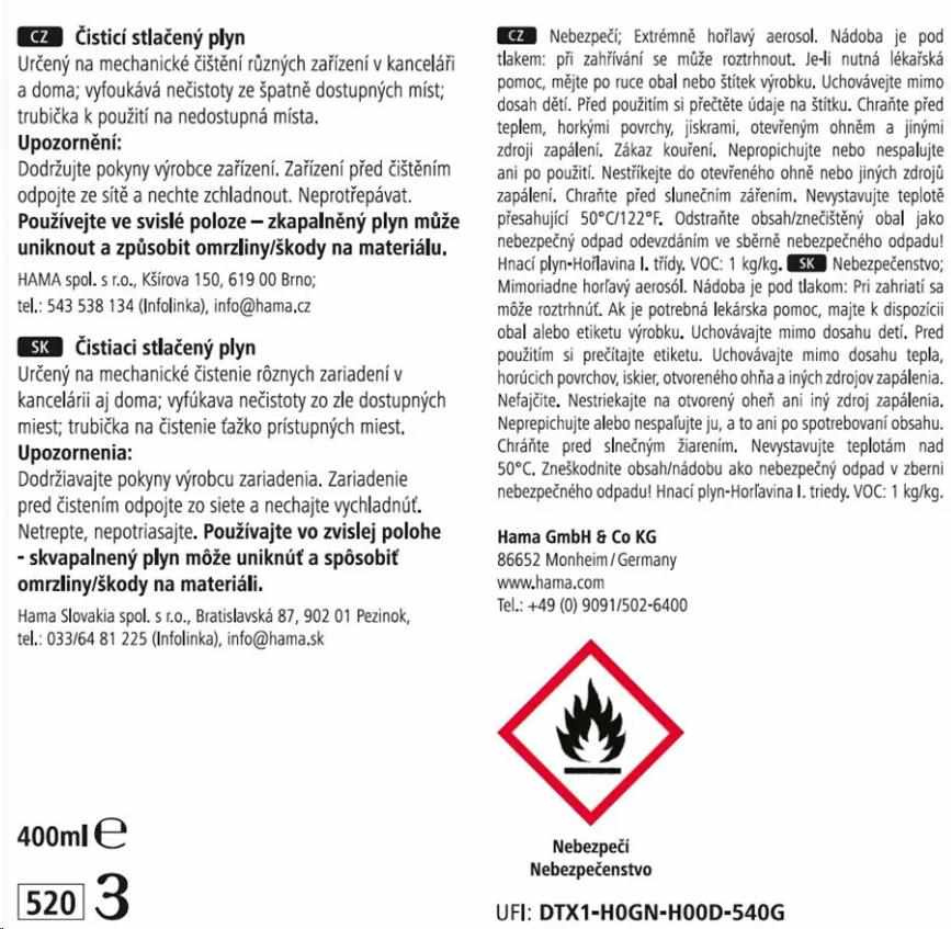 - stlačený vzduch určený k čištění různých zařízení v kanceláři a doma - vyfoukává nečistoty ze špatně dostupných míst - hadička k použití na nedostupná místa - objem: 400 ml Poznámka pro spotřebitele: Před čištěním si přečtěte informace uvedené v návodu k obsluze zařízení. Zařízení odpojte od elektřiny a nechejte vychladnout. Čisticí vzduch neprotřepávejte a používejte pouze ve svislé poloze, jinak by tekutý plyn mohl uniknout a způsobit námrazu na zařízení, případně jej poškodit. Prázdný obal zlikvidujte podle příslušných nařízení..