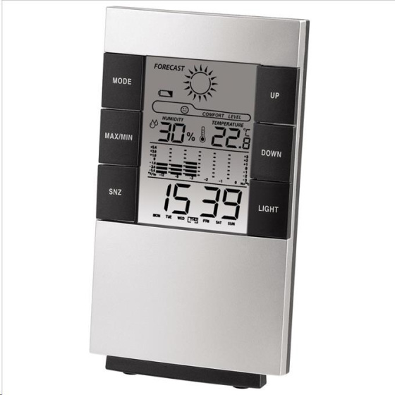 Akční nabídky na váš e-mail- digitální zobrazení teploty, vlhkosti vzduchu, času, dne v týdnu, data, vývoje teploty vzduchu a předpovědi počasí