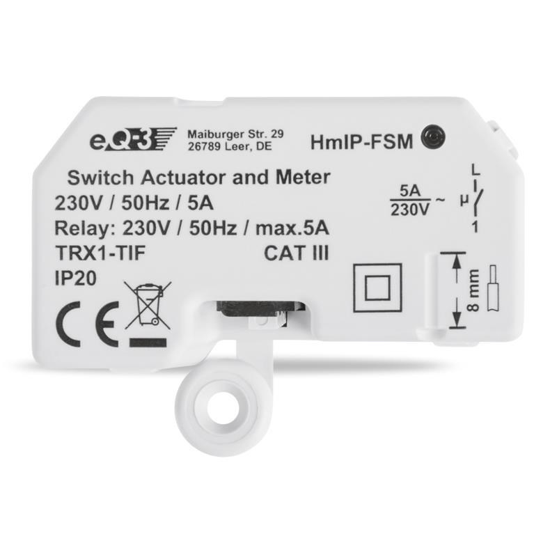 Programovatelný bezdrátový Spínací akční člen s měřením (HmIP-FSM) pro skrytou montáž, napájený ze sítě 230 V, je součástí systému chytré domácnosti Homematic IP.