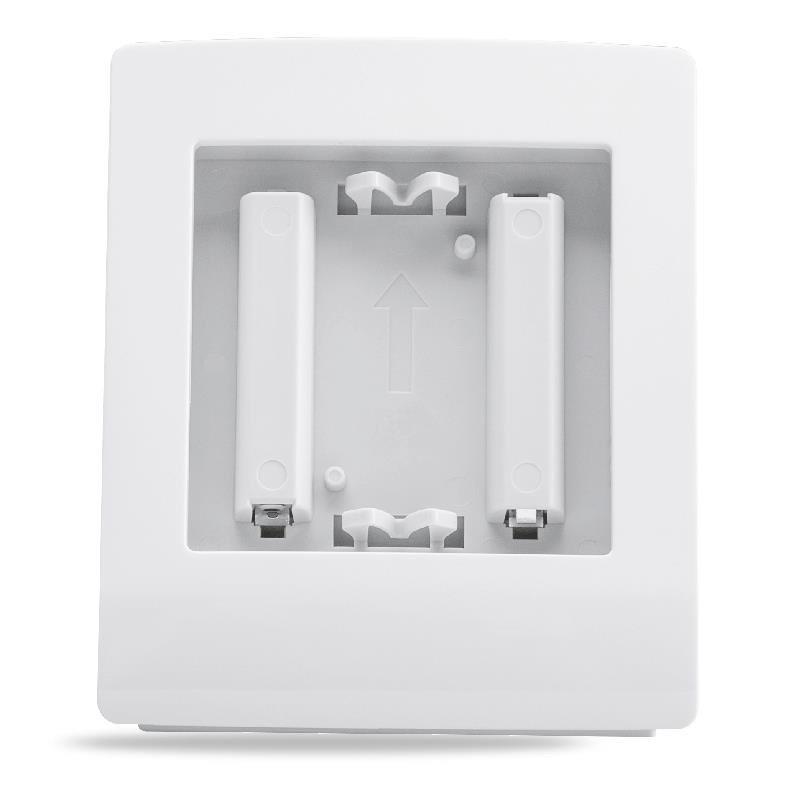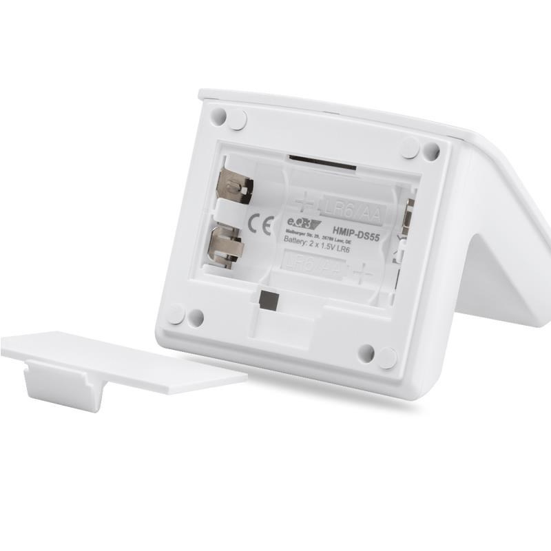 Pod krytem ve spodní části zařízení se nachází zásobník pro dva kusy tužkových napájecích baterií 1,5 V typu AA a stojánek tak může velmi dobře pracovat jako dokovací napájecí stanice i pro vložená zařízení bez napájecích baterií. Pokud je do Stojánku (HmIP-DS55) s bateriemi integrován bezdrátový bateriový prvek, bude navýšena pracovní doba této komponenty v důsledku použití baterií typu AA namísto běžně používaných baterií typu AAA přímo v zařízení.