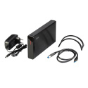 Pevná hliníková konstrukce rámečku zajišťuje účinný odvod tepla a ochranu pevného disku. Součástí balení je i stojan, rámeček tedy můžete mít postaven ve vertikální poloze a šetřit místo na pracovním stole.