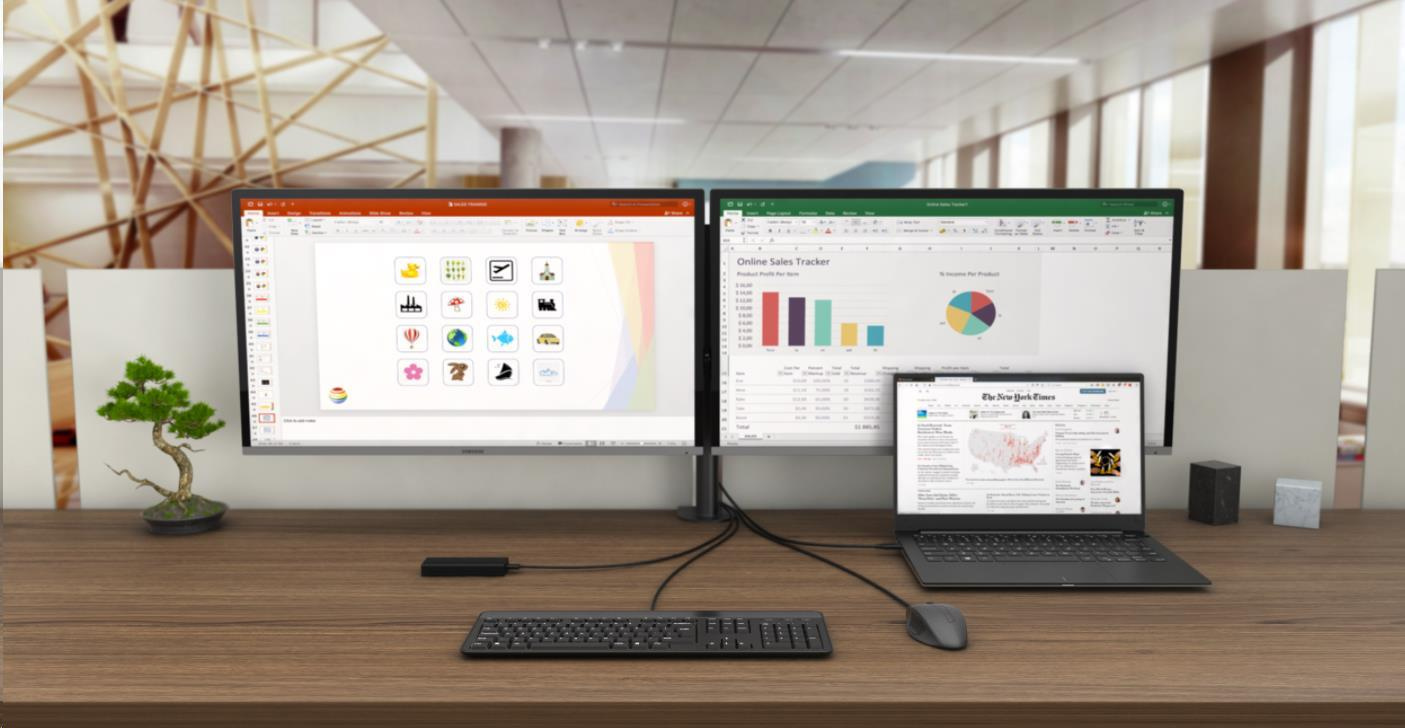 Akční nabídky na váš e-mailKancelářská dokovací stanice USB-C, která podporuje až 2x externí monitor v rozlišení 4K. Stanice je kompatibilní s jakýmkoliv notebookem vybaveným portem USB-C nebo Thunderbolt 3. 6x USB port, spolehlivé a rychlé připojení do podnikové sítě díky integrovanému LAN portu, napájení až 100 W a podpora instalace za monitor, to vše z této dokovací stanice dělá ideálního společníka pro profesionály.